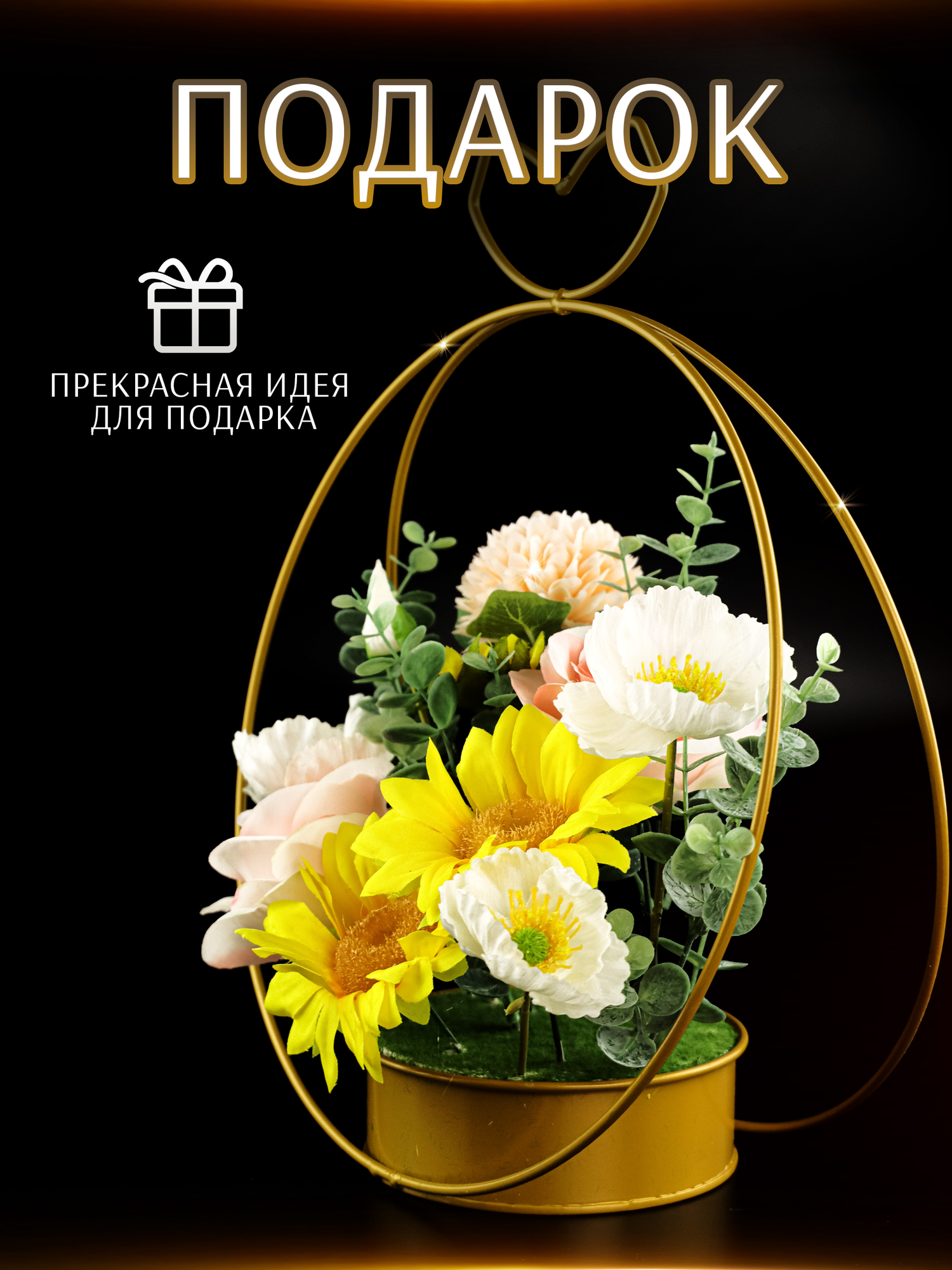 Ваза корзина искусственных цветов и сухоцветов декоративная золотая круглая