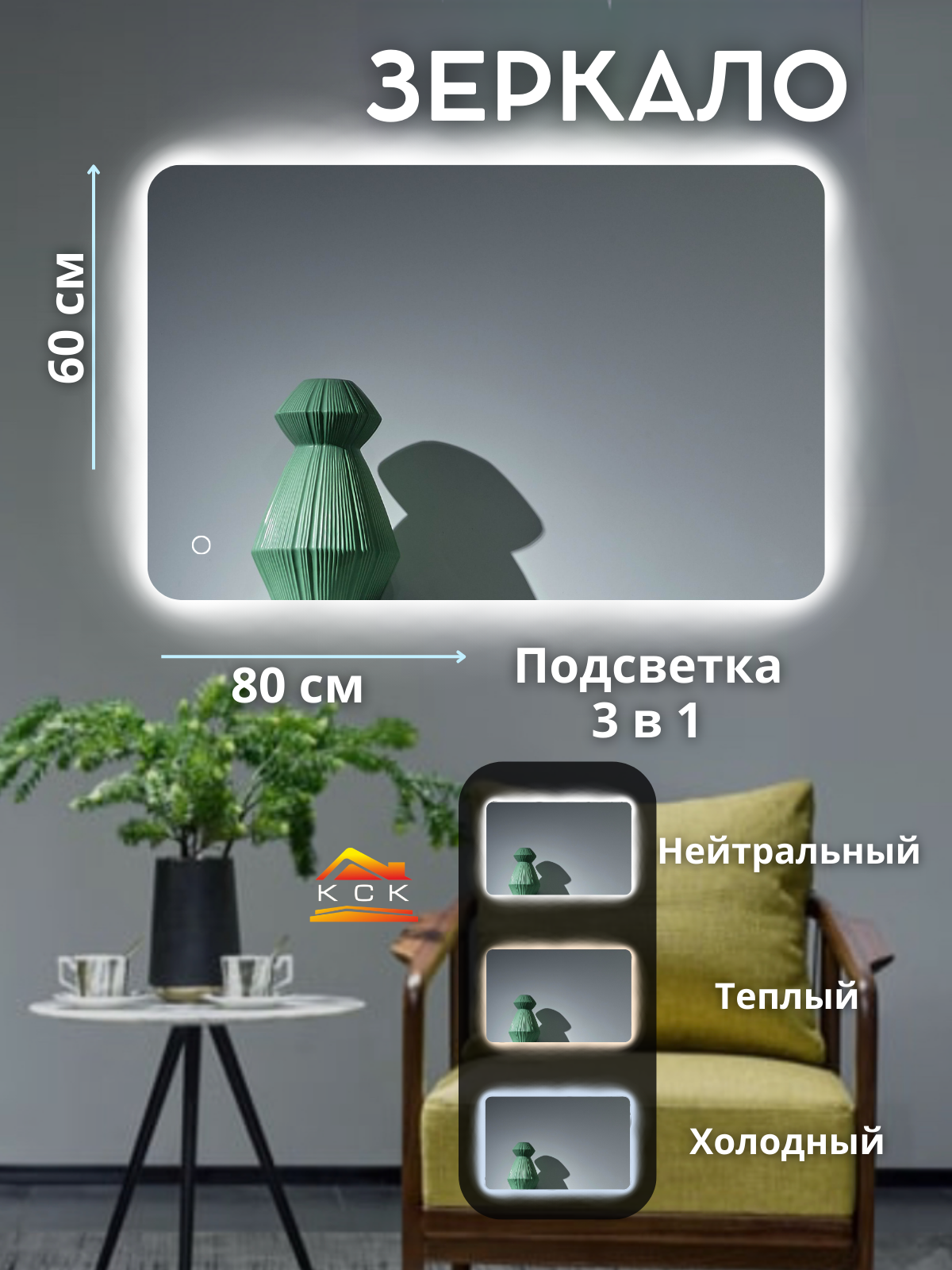 Зеркало настенное для ванной с подсветкой 60 на 80 см.(круглые углы)