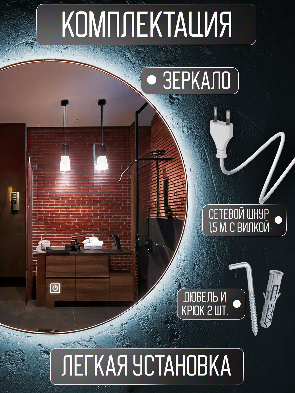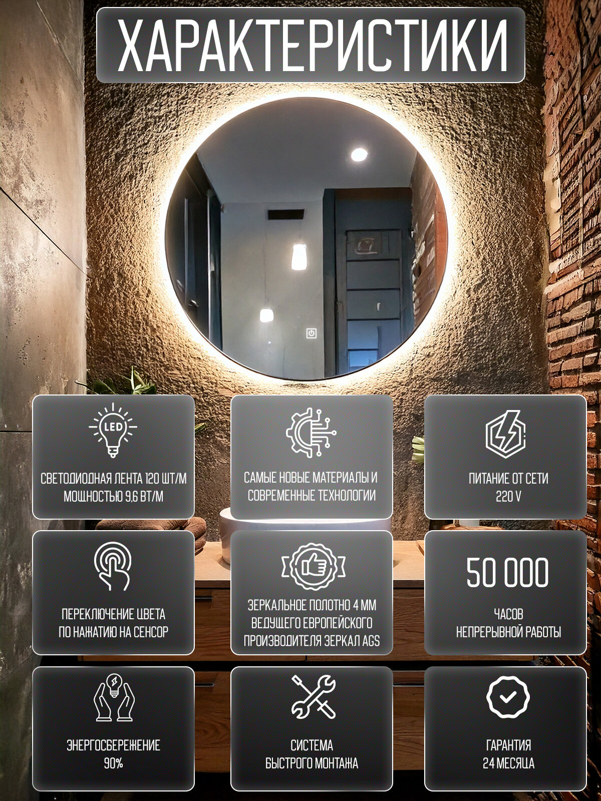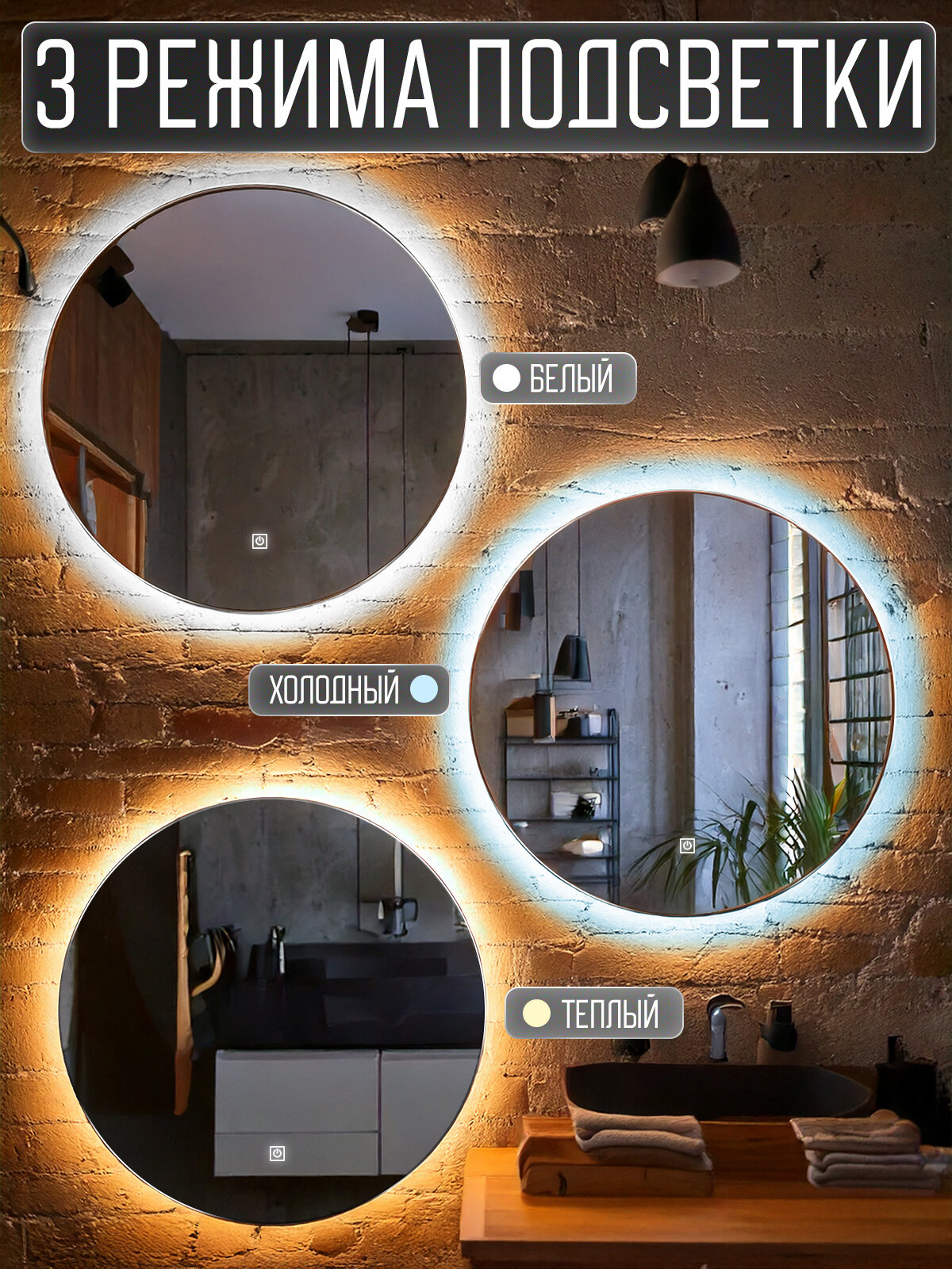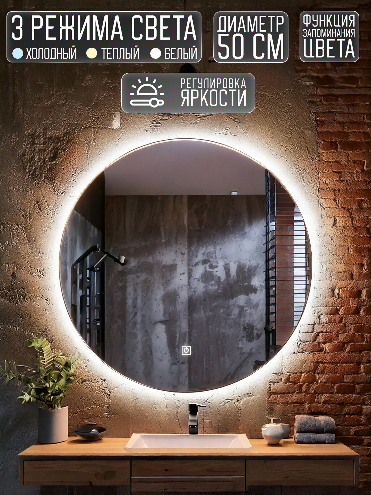 Зеркало для ванной круглое с LED подсветкой 3 в 1 (3000К теплый, 4500К нейтральный, 6000 К холодный) размер 50 на 50 см. интересное: