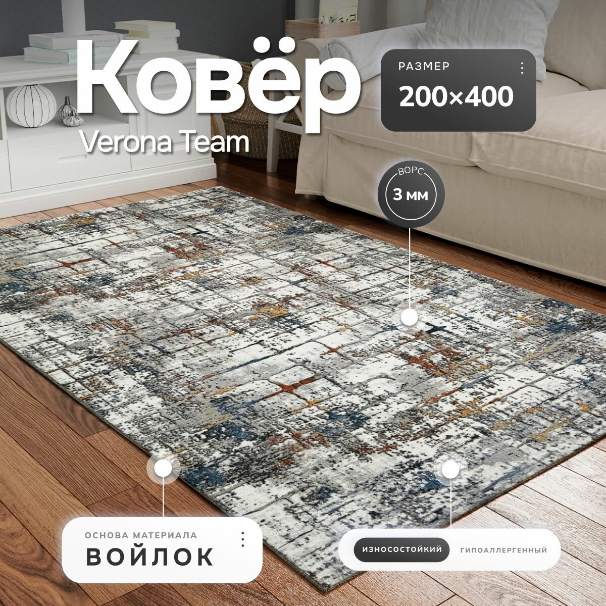 Ковер на пол, Палас для комнаты VERONA TEAM 200х400 см (2х4 м)