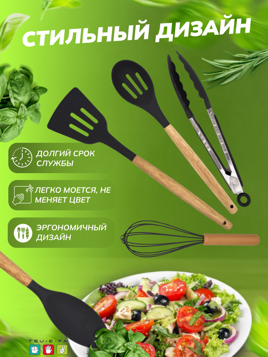 Набор кухонных принадлежностей из силикона и бамбука 12 штук черный интересное: