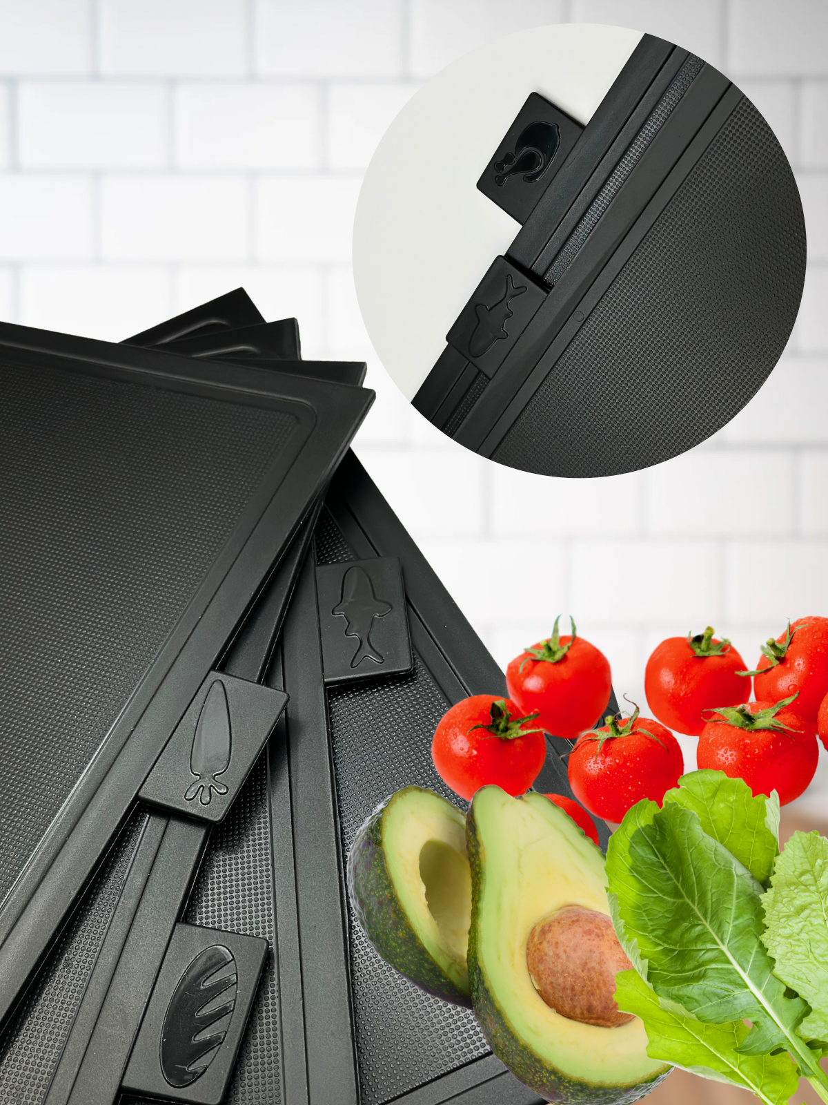 | Особенности | антибактериальное покрытие / антиналипающее покрытие / гибкая / для кухонной мойки / маркировка типа продуктов / мытье в посудомоечной машине / нескользящая / нескользящее основание / с контейнером |