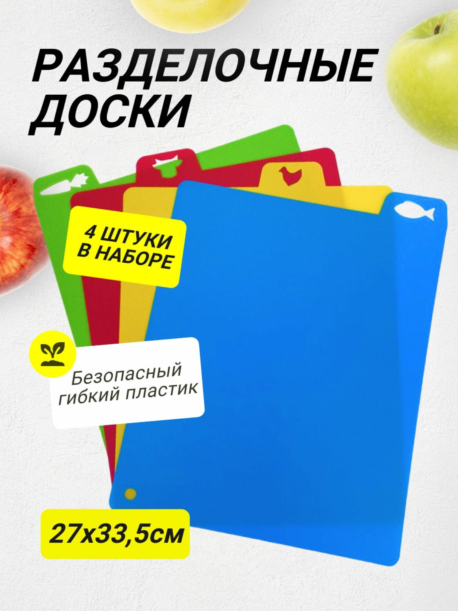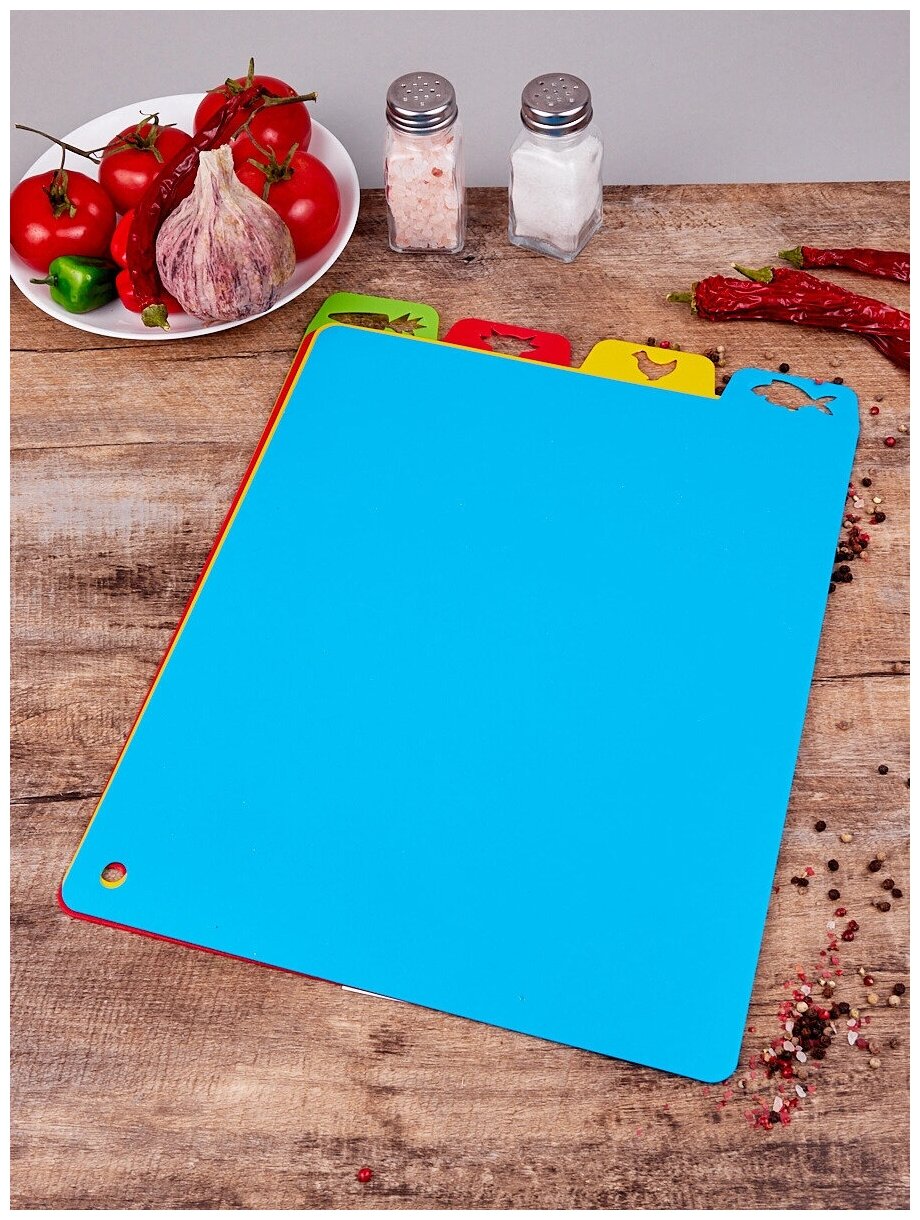 | Подробная комплектация | набор из 4ёх гибких разделочных досок с ярлыком |