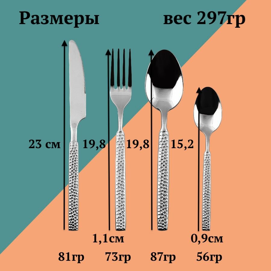 | В набор входит | Набор состоит из 4х предметов: Вилка, Нож, Ложка обеденная, Ложка чайная. |