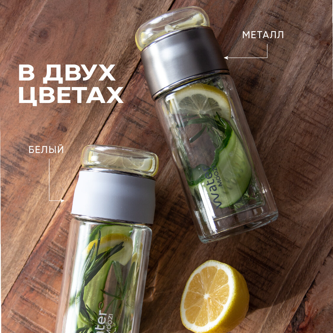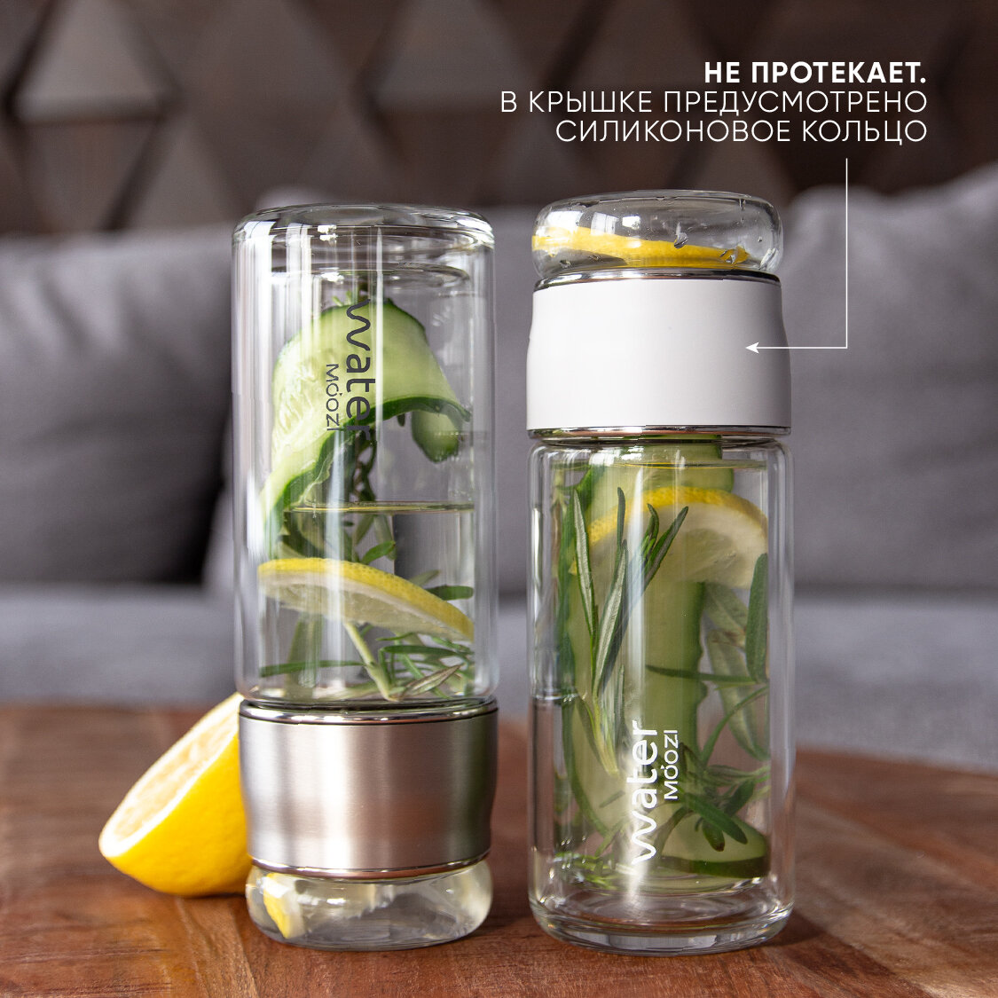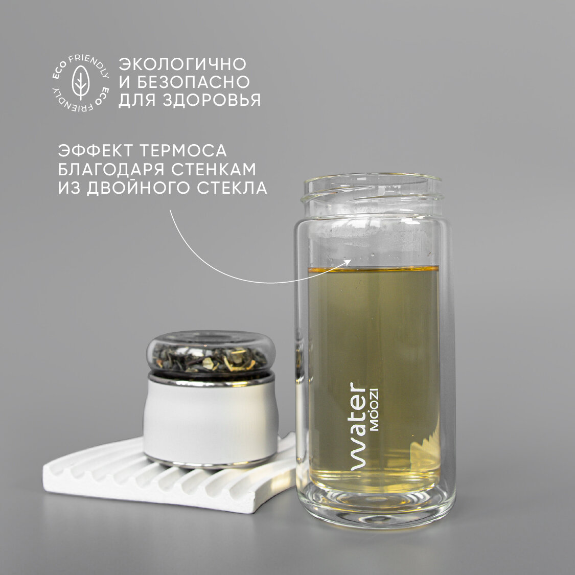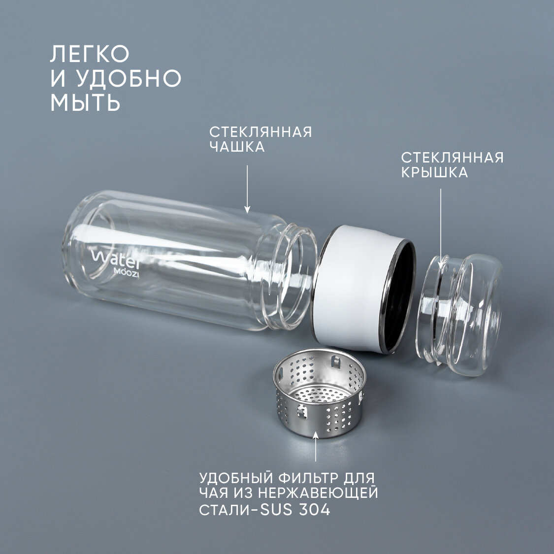 Стеклянная бутылка MOOZI Water для заваривания чая, объем 300 мл, цвет серебристый