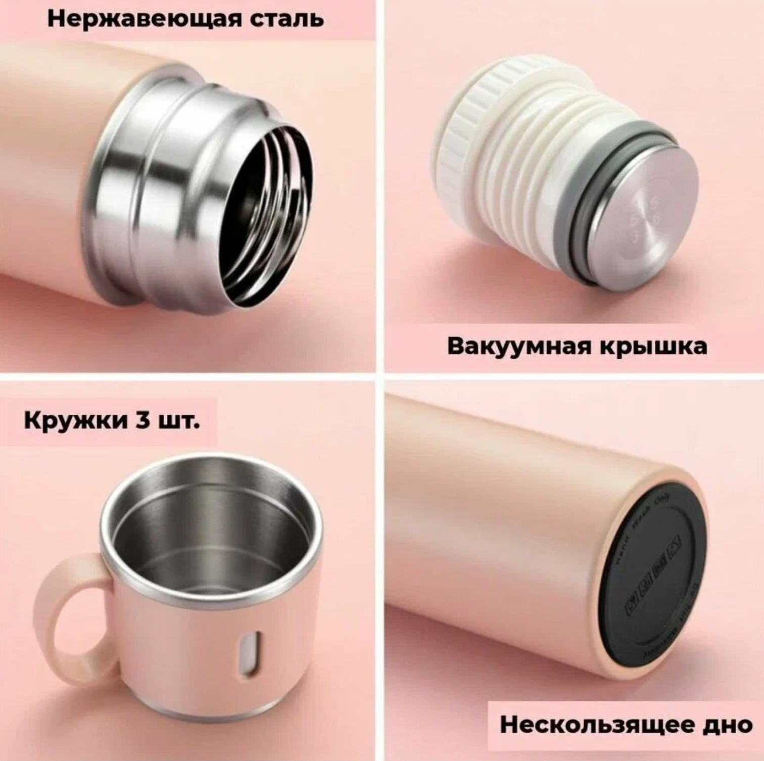Термос вакуумный с двумя кружками / Подарочный набор / Объем 500 мл / Термокружка Розовый интересное: