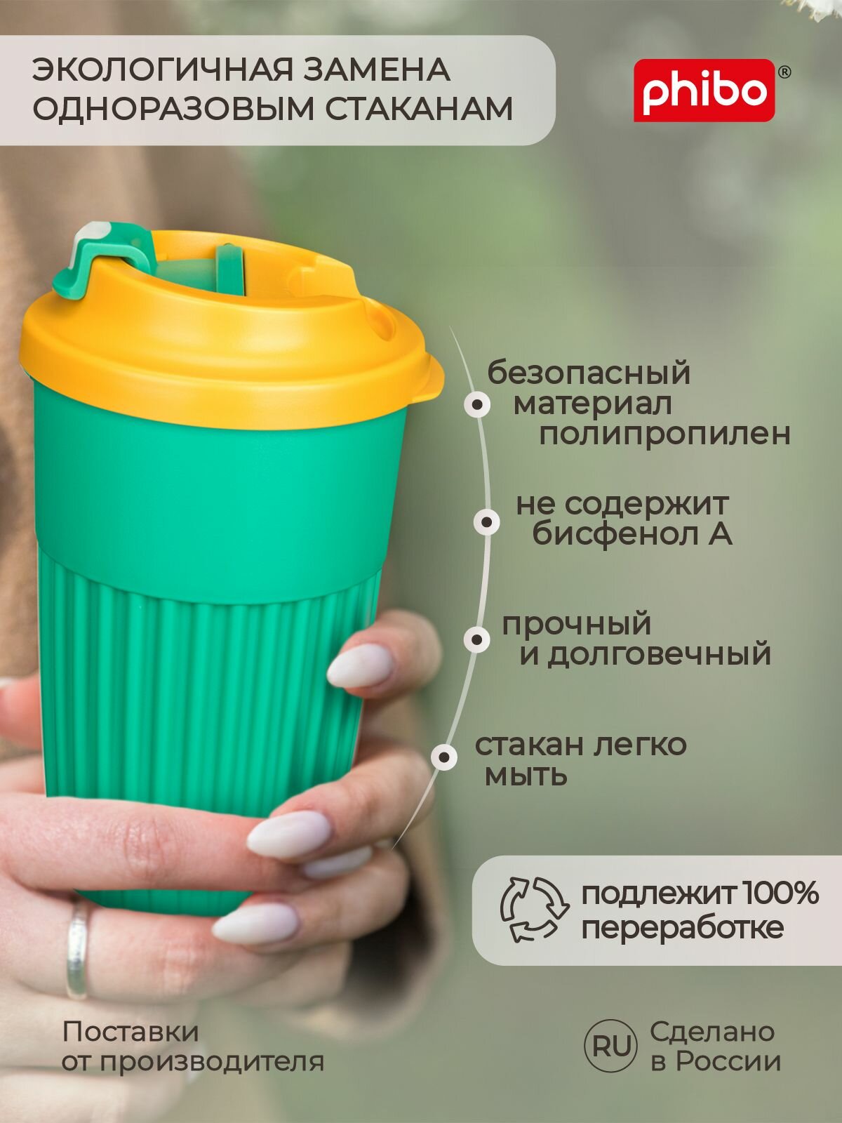 Купить Стакан для горячих напитков Бытпласт Зеленый, с клапаном, 450 мл
