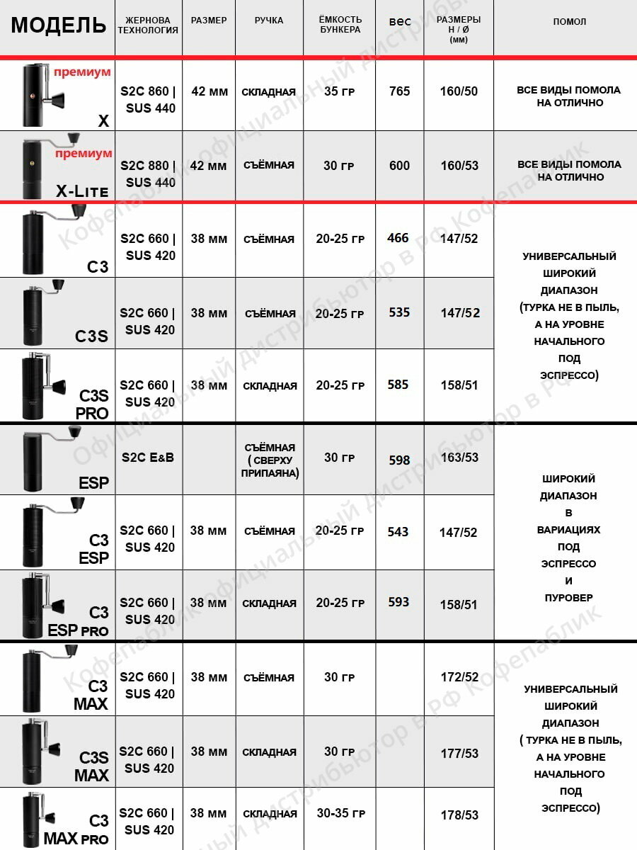 | Дополнительная информация | емкость на 25 г; длина ручки 159 мм; система регулировки помола: эспрессо – 6-12 щелчков, аеропресс – 12-15 щелчков, пуровер 15-24 щелчка, фреч-пресс – 24-27 щелчков |