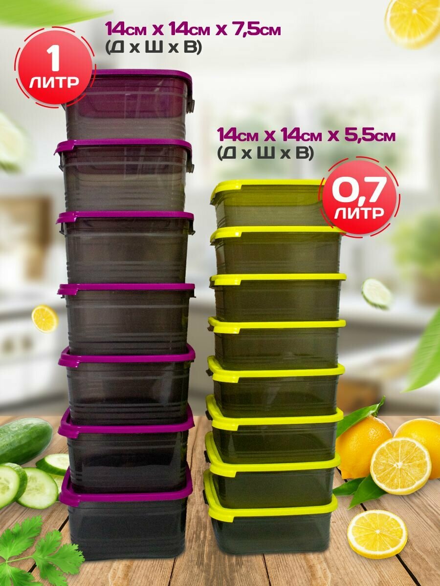 Набор пластиковых контейнеров для хранения и заморозки, Ангора, 0,7 и 1 литр, 15 штук, желтый / фуксия интересное:
