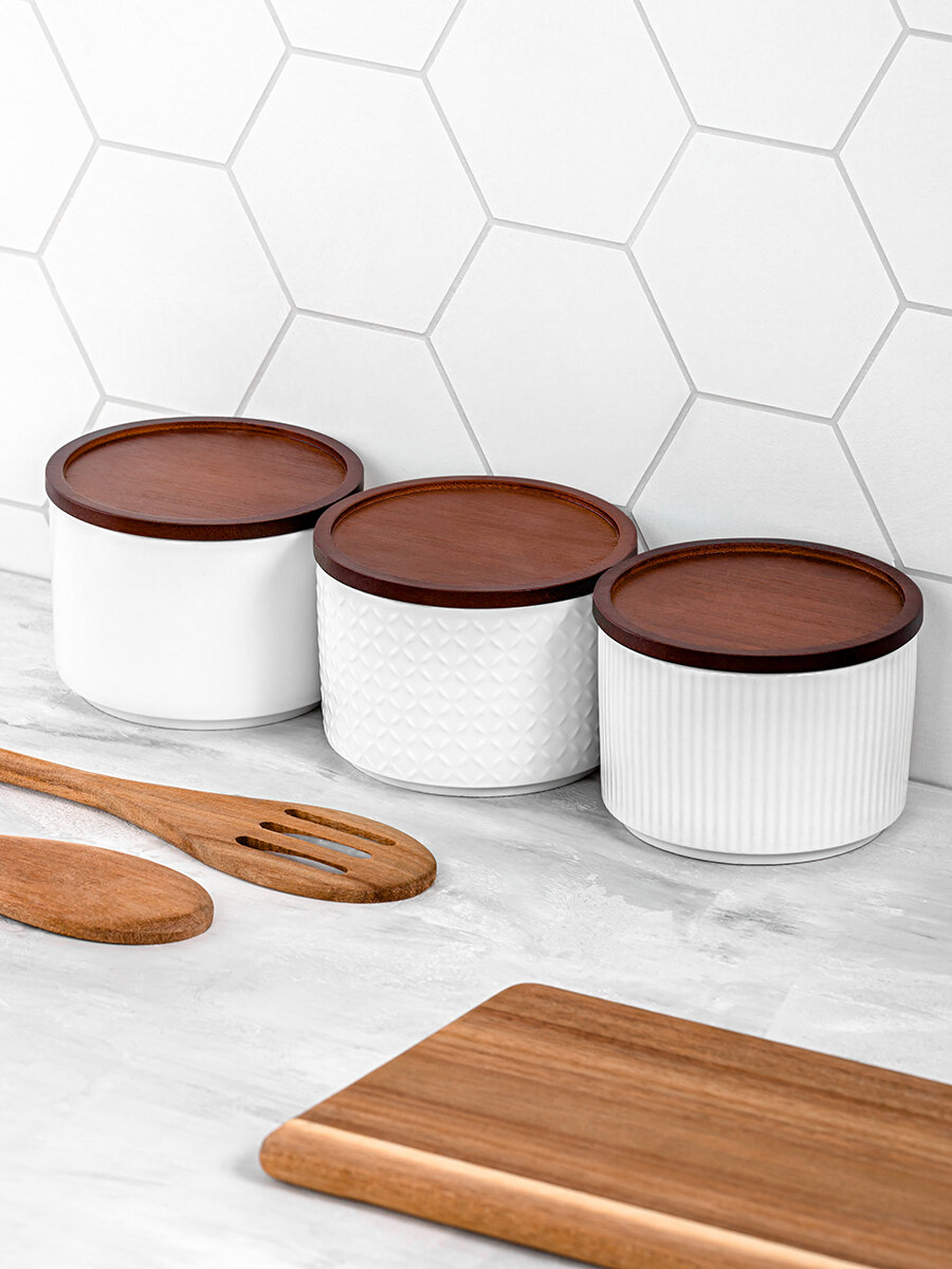 Банка для хранения / форма для запекания 250 мл - 3 шт Elan Gallery Микс, Колоранс, белый, с деревянной крышкой-подставкой с сил. упл. интересное: