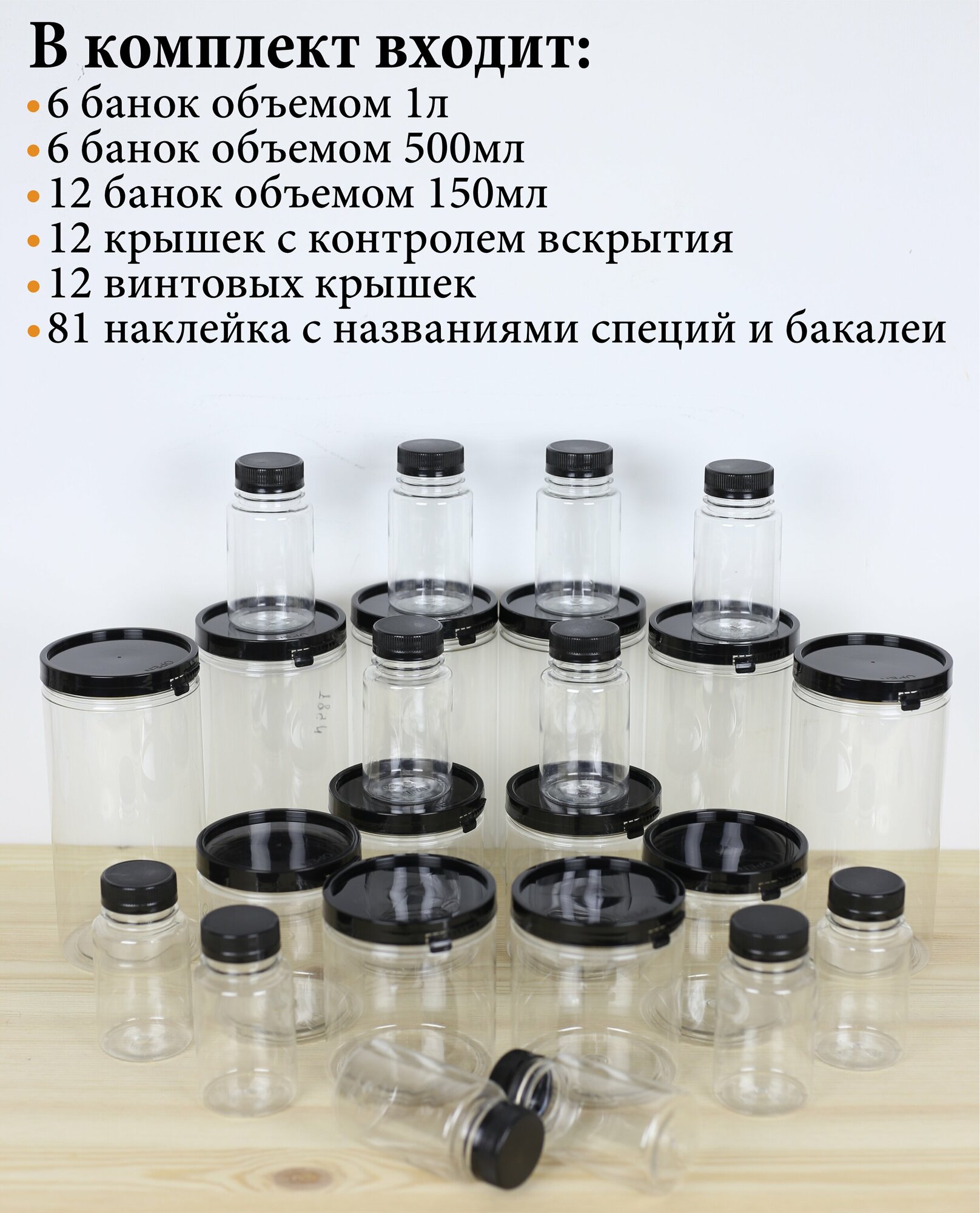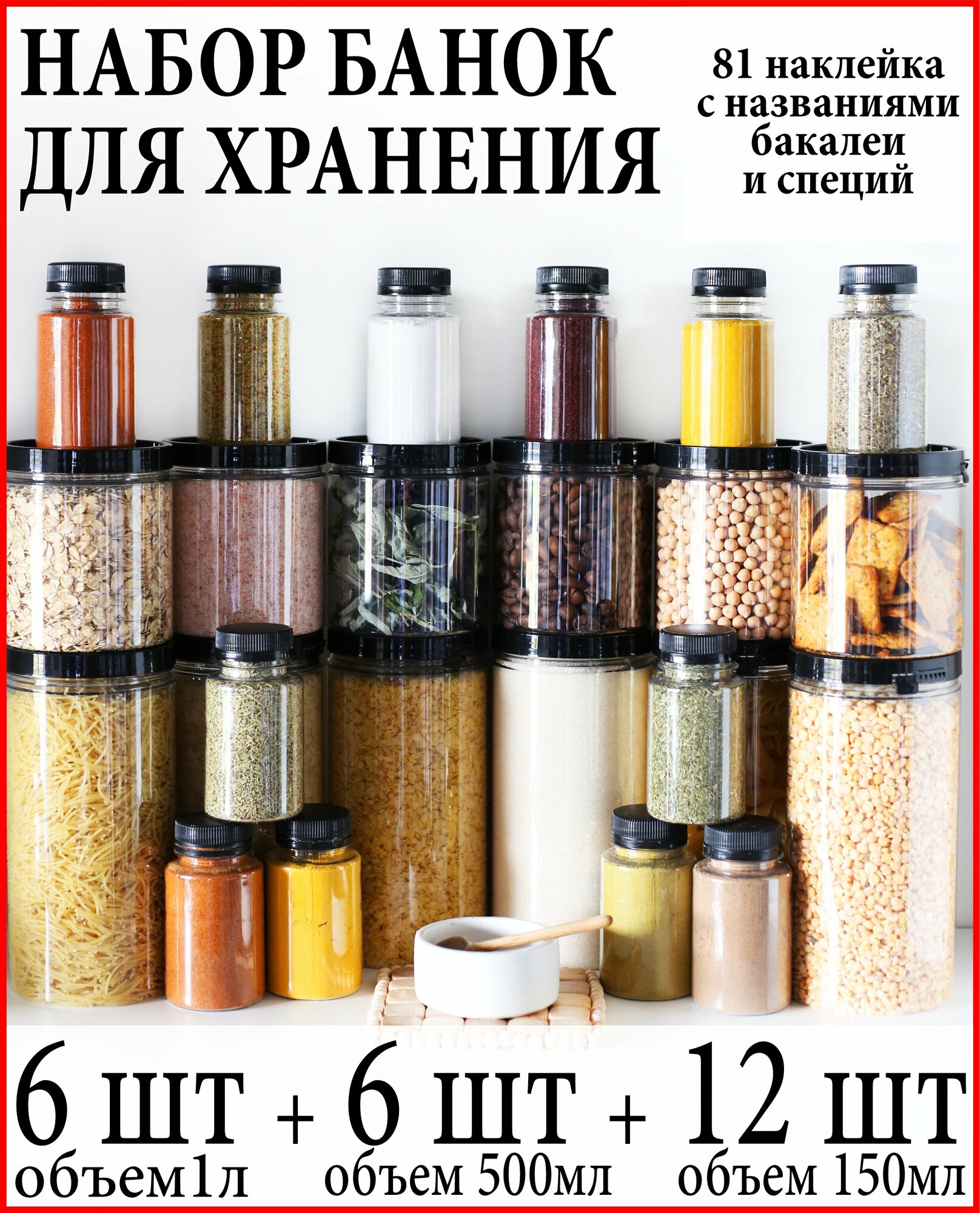 | Комплектация | 6 банок объемом 1000мл, 6 банок объемом 500мл, 12 банок объемом 150мл, 20 белых наклеек для самостоятельного заполнения, 81 наклейка с названиями бакалеи и специй |