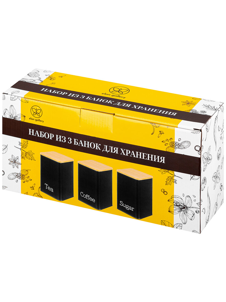 Купить Набор 3 банок для хранения сыпучих продуктов1,1 л Elan Gallery "Tea, coffee, sugar", черный, с бамбуковыми крышками
