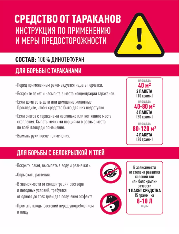 | Способ применения | От тараканов. Вскрыть содержимое пакетика и высыпать в месте обнаружения тараканов. От тли и беловкрылки. В зависимости от степени развития колоний тли и белокрылки 5 граммов на 8-10 литров воды. От тараканов работает с первого дня, после применения и имеет постепенно накапливаемый, так называемый кумулятивный эффект. |