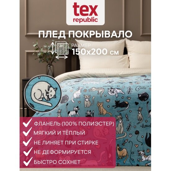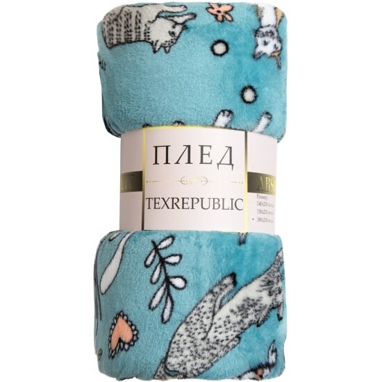 СохранитьПлед TexRepublic Absolute 150х200 см, 1,5 спальный, велсофт, покрывало на диван, теплый, мягкий, голубой, серый с рисунком котики интересное: