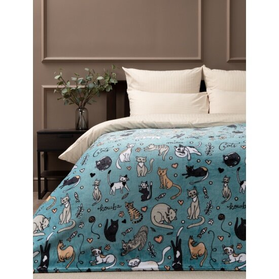 Плед TexRepublic Absolute 180х200 см, 2 спальный, фланелевый, покрывало на диван, теплый, мягкий, ментоловый с принтом коты