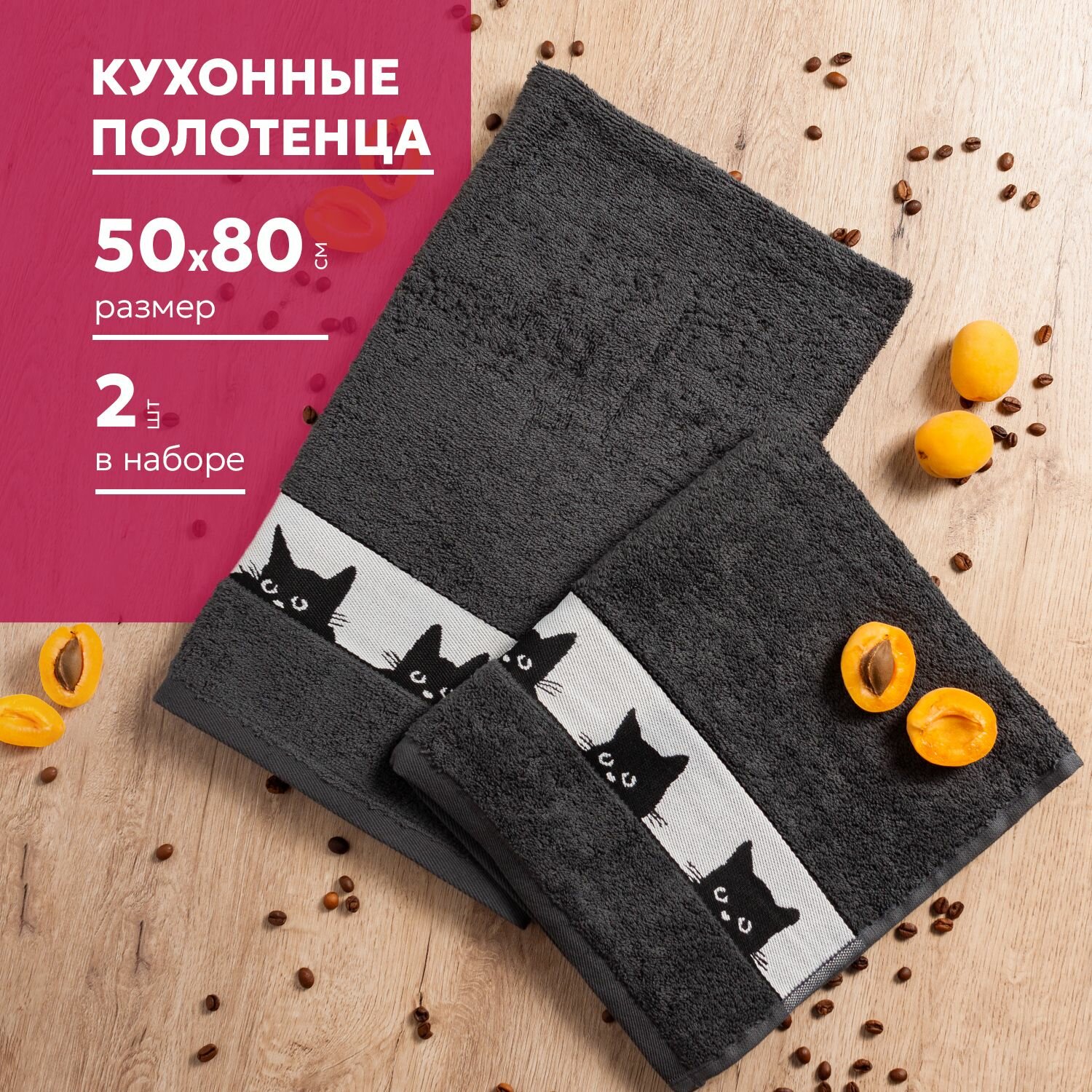 Полотенца махровые кухонные 50х80 см, набор 2 шт, Китчен, котики / темно-серые интересное: