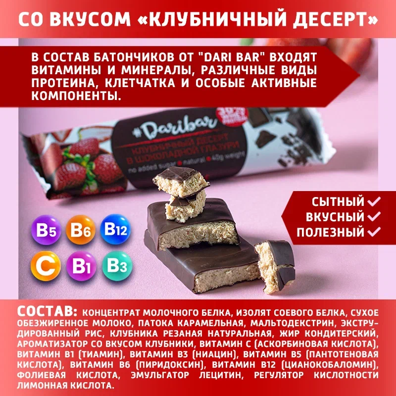 Сохранитьпротеиновый глазированный батончик "Daribar" 30% белка, "клубничный десерт" , 40гр., 25 шт интересное: