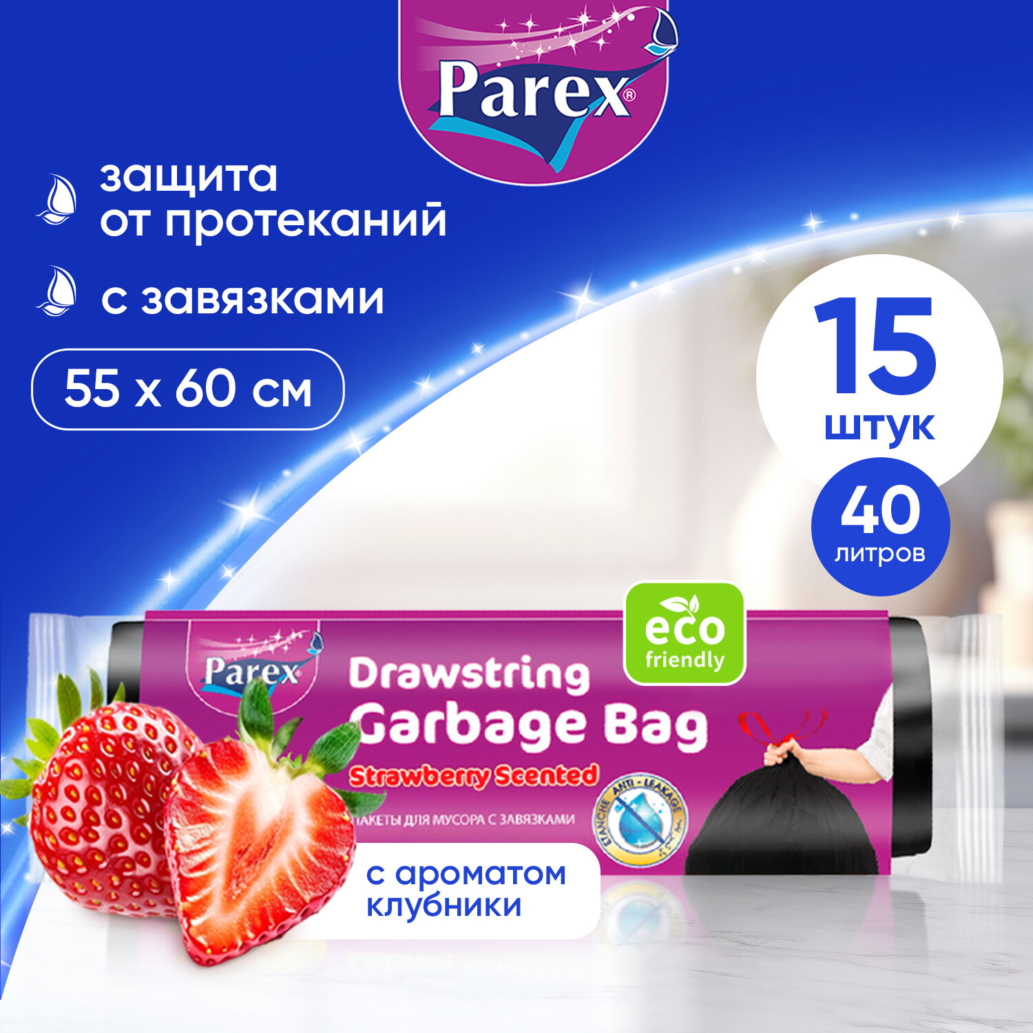 Купить Пакеты для мусора Parex с завязками и ароматом клубники, биоразлагаемые 15 шт, 40 литров