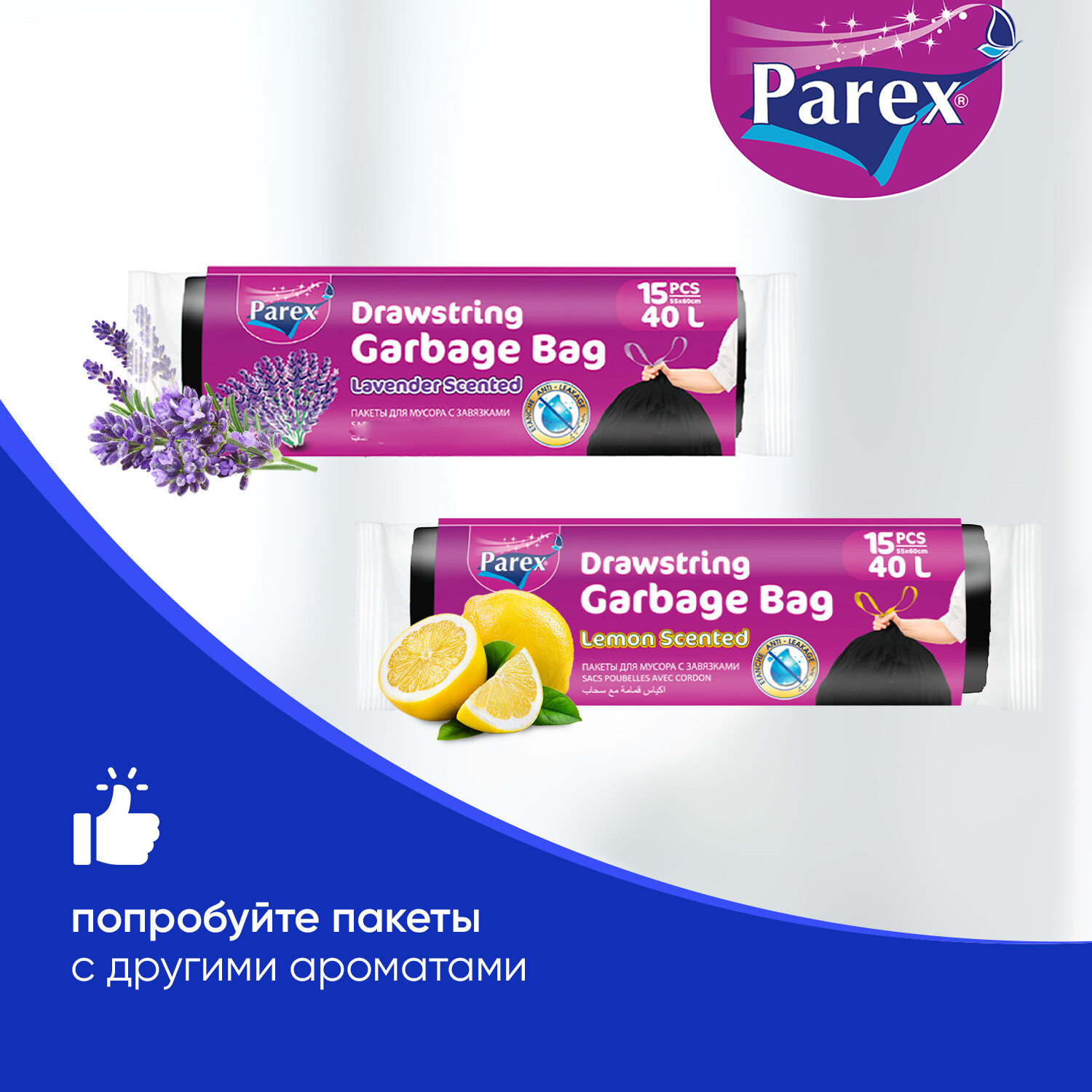 Пакеты для мусора Parex с завязками и ароматом лаванды, биоразлагаемые 15 шт, 40 литров