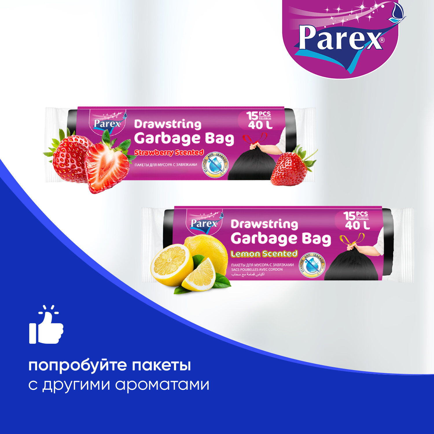 Пакеты для мусора Parex Клубника и Лимон, биоразлагаемые мешки с завязками, 60 шт, 40 литров