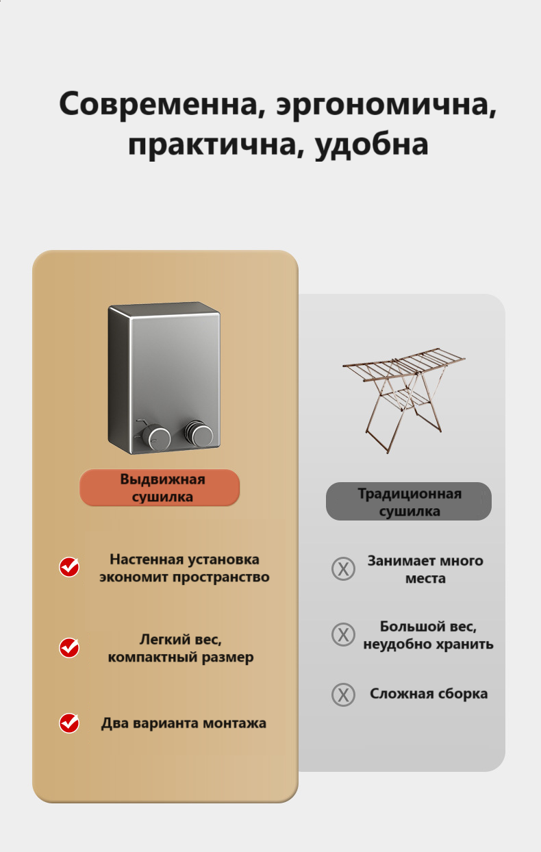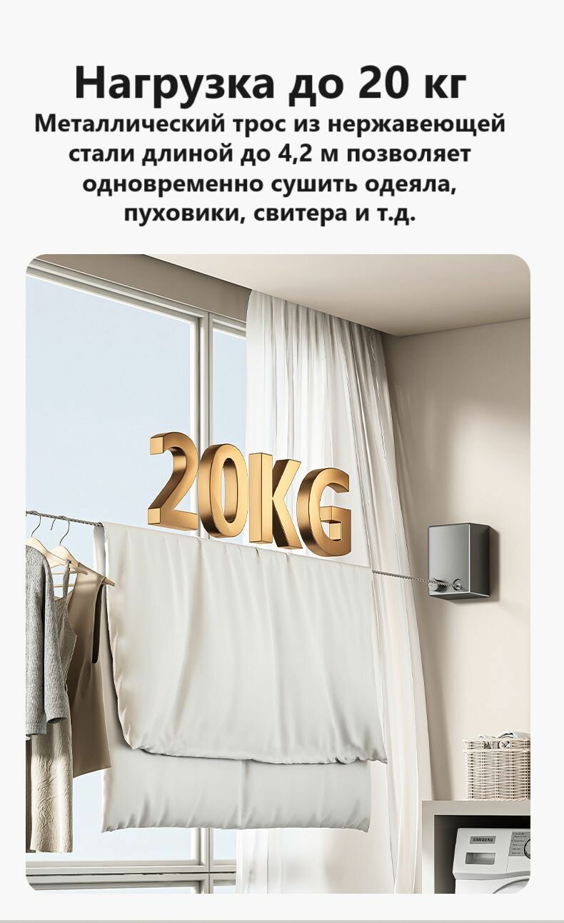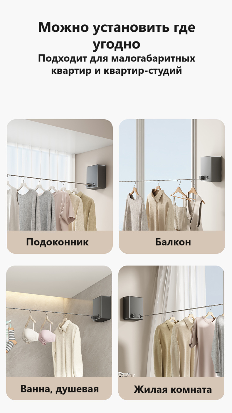 | Особенности | автоматическое сматывание / держатель для вешалок / держатель для мелких предметов / для деликатных вещей / регулировка длины |