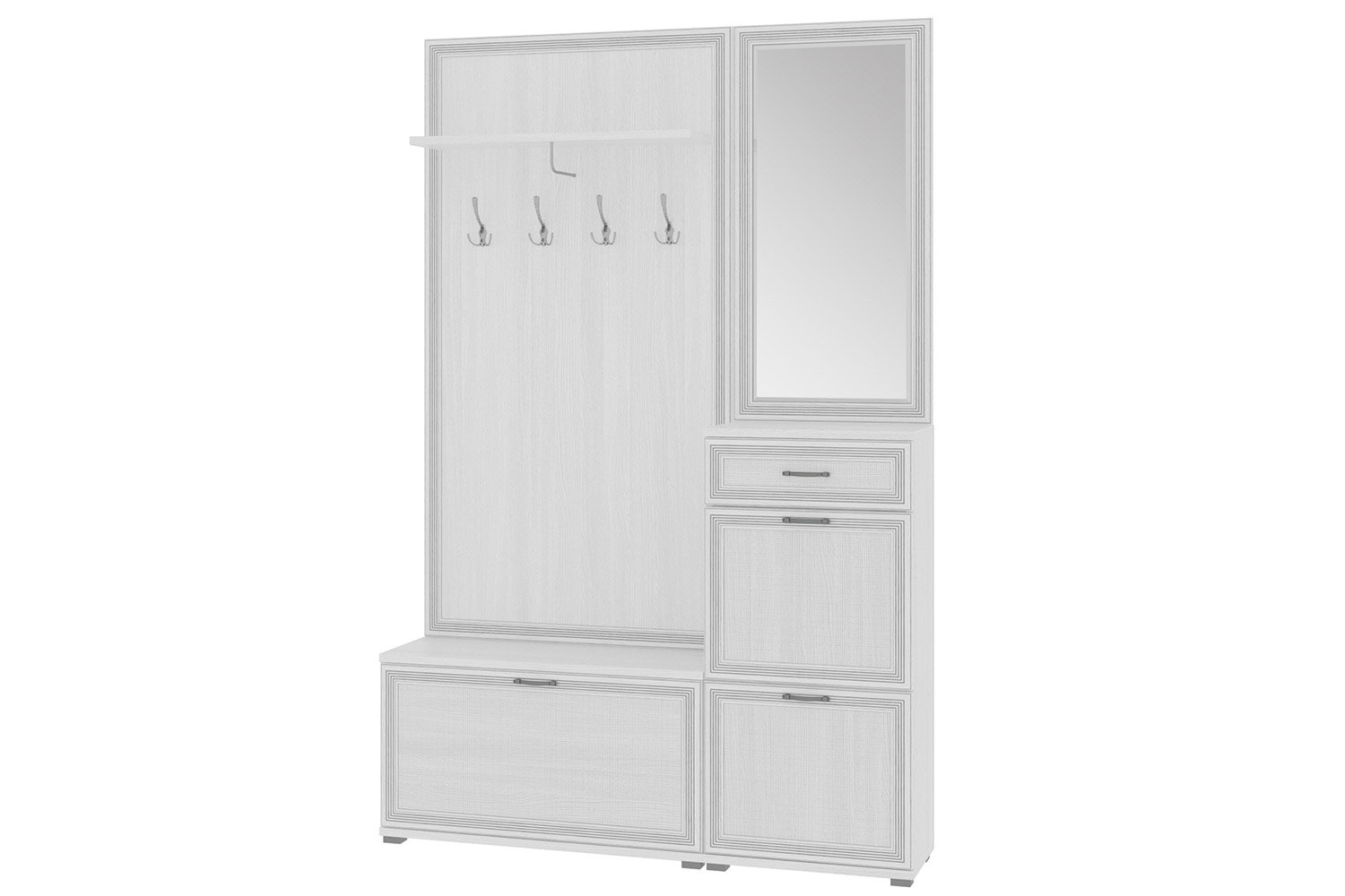 | Состав комплекта | 3 тумбы для обуви / 4 крючка / ящик / полка и зеркало |