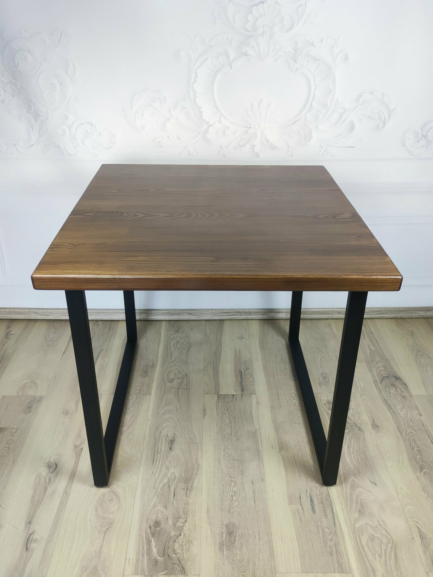 Купить Стол кухонный Loft квадратный со столешницей цвета темного дуба из массива сосны 40 мм и черными металлическими ножками, 70x70х75 см