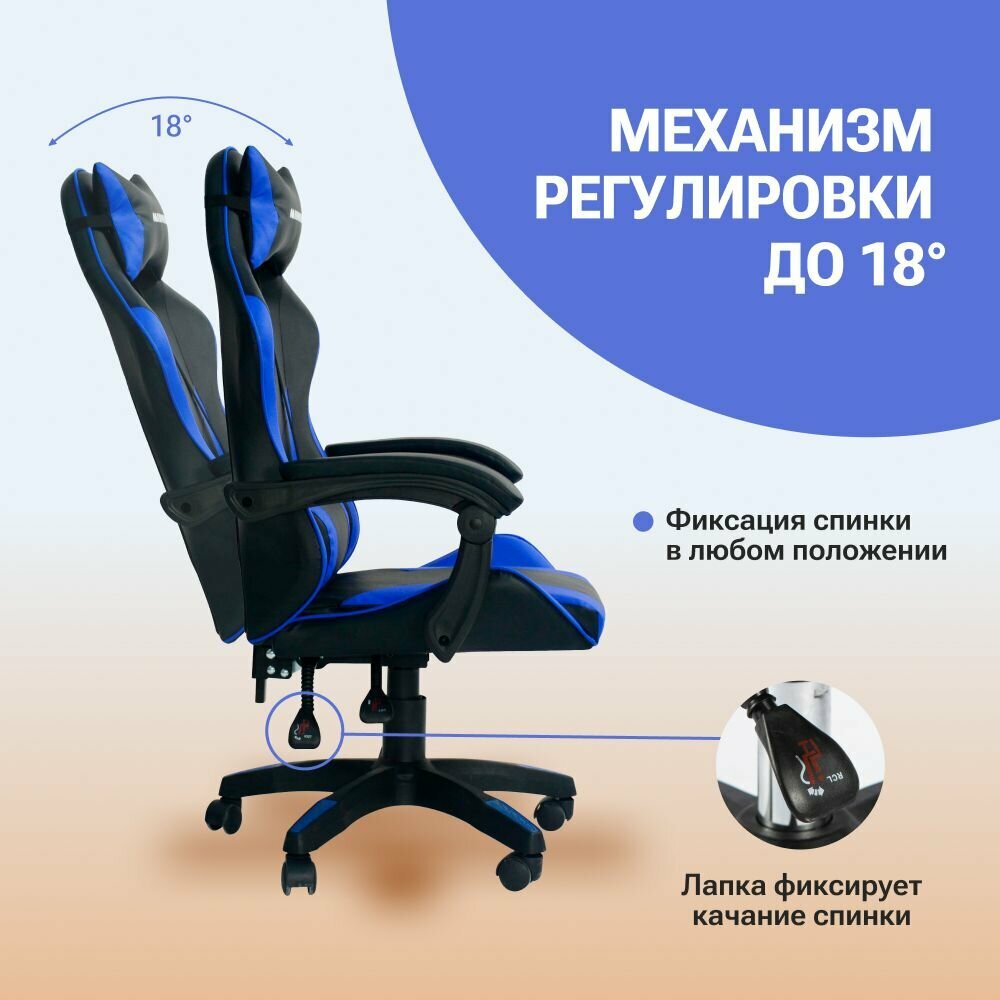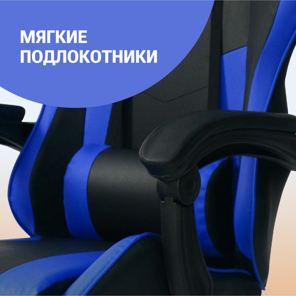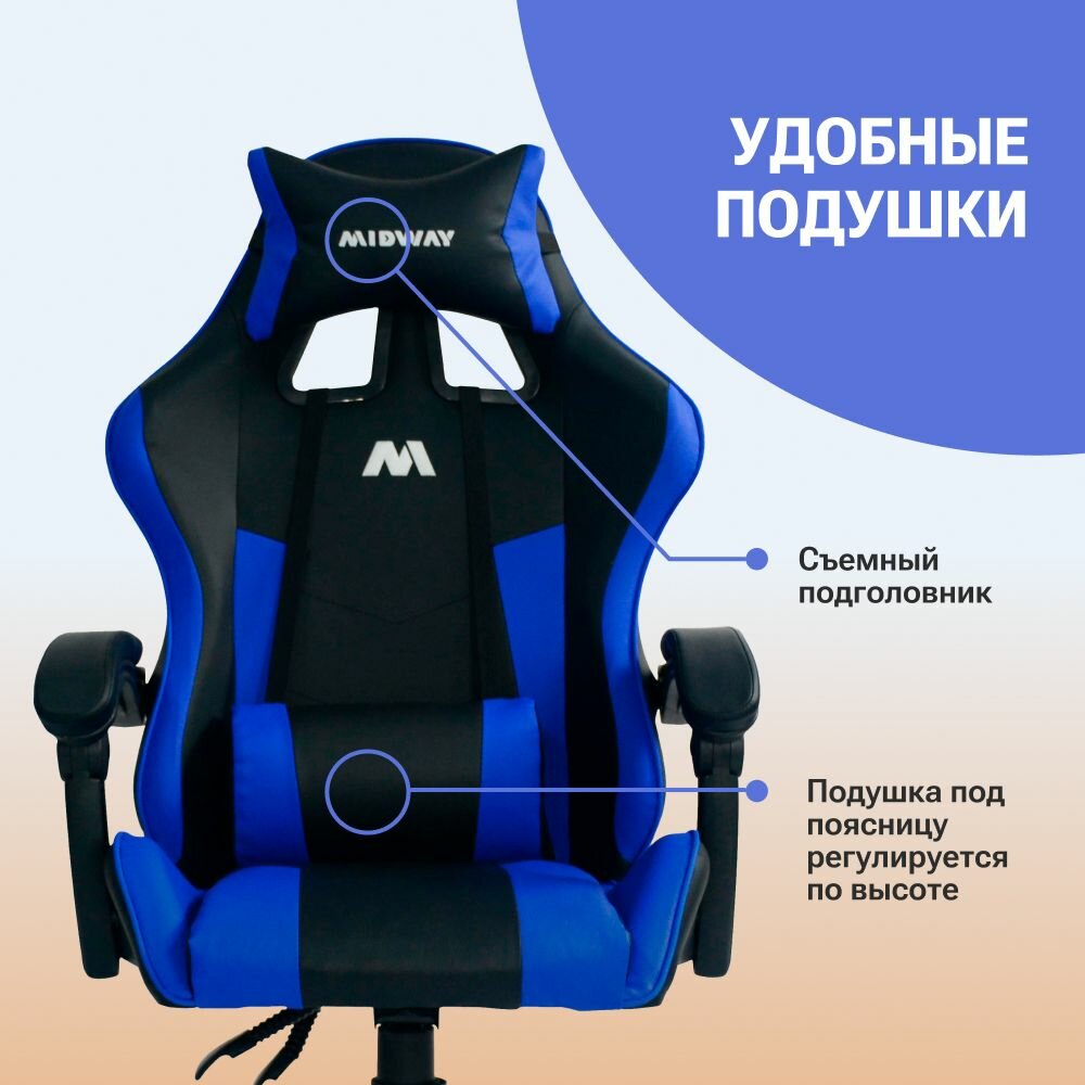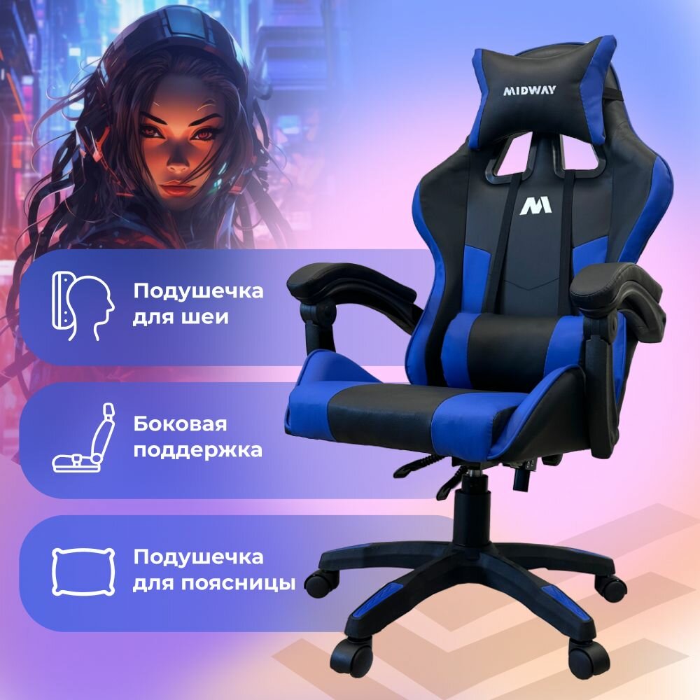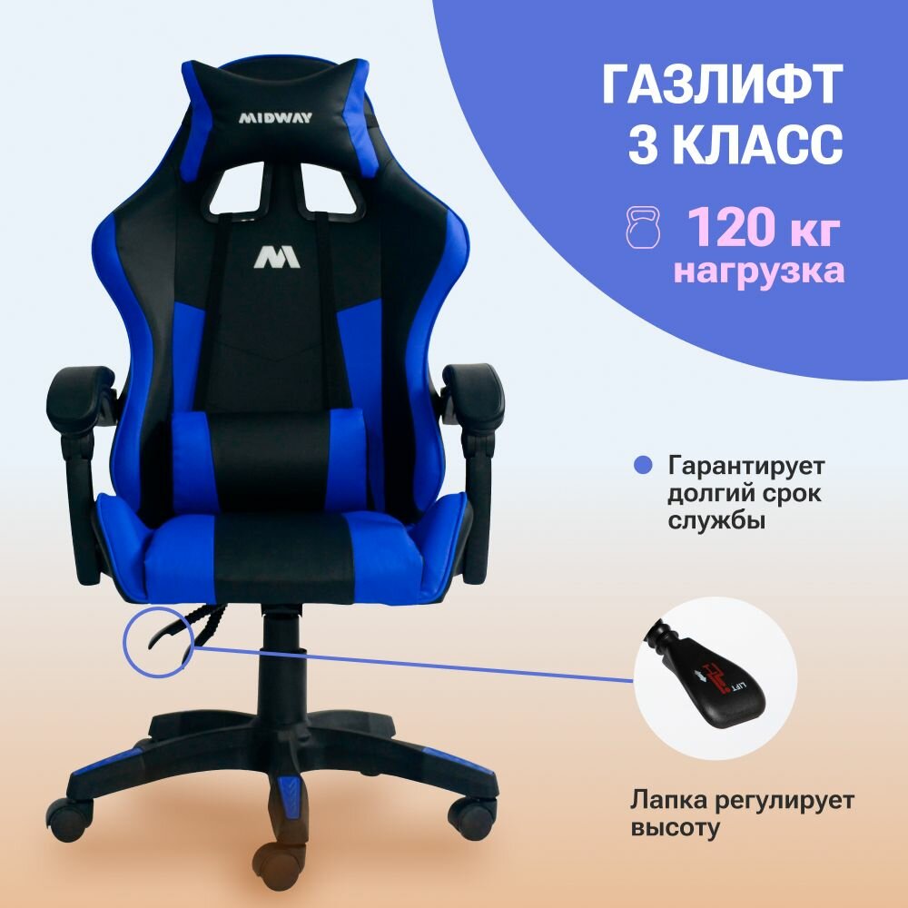 СохранитьКомпьютерное игровое кресло на колёсиках MIDWAY Axe, синий (эргономичное, с обивкой из экокожи) интересное: