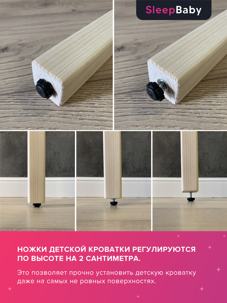 | Комплектация | Детская кроватка в дополнительной упаковке, реечное дно, регулируемые по высоте ножки, крепеж для сборки, ключ для сборки, инструкция, информационный вкладыш, подарок для малыша, запасные крепежи |