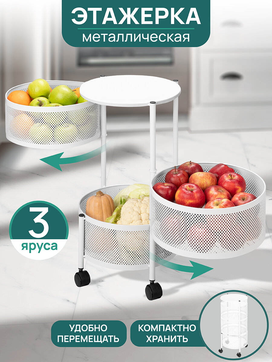 | Дополнительная информация | Этажерка 3-х ярусная на колесиках "Белая" 33,5х32х60,5 см, размер этажерки без колесиков 33,5х32х55,5 см, на 4-х колесиках, 2 колесика с фиксаторами, диаметр полки 30 см, размер корзин 29,5х29,5х14 см, расстояние между корзинами 15,5 см, высота от пола до нижней корзины без колес - 3,5 см, с колесами - максимальная нагрузка на каждую корзину 5 кг, металлическая |