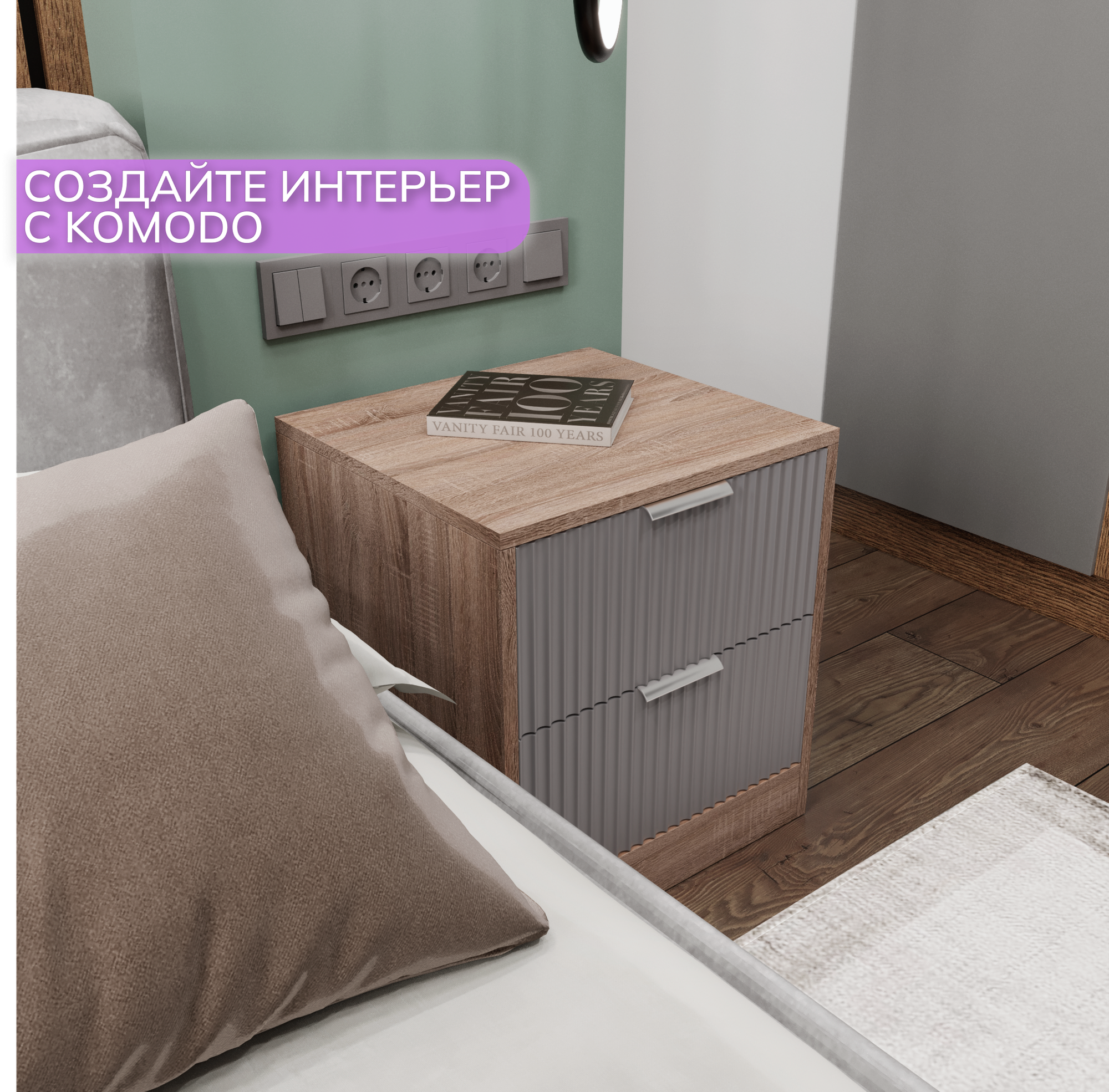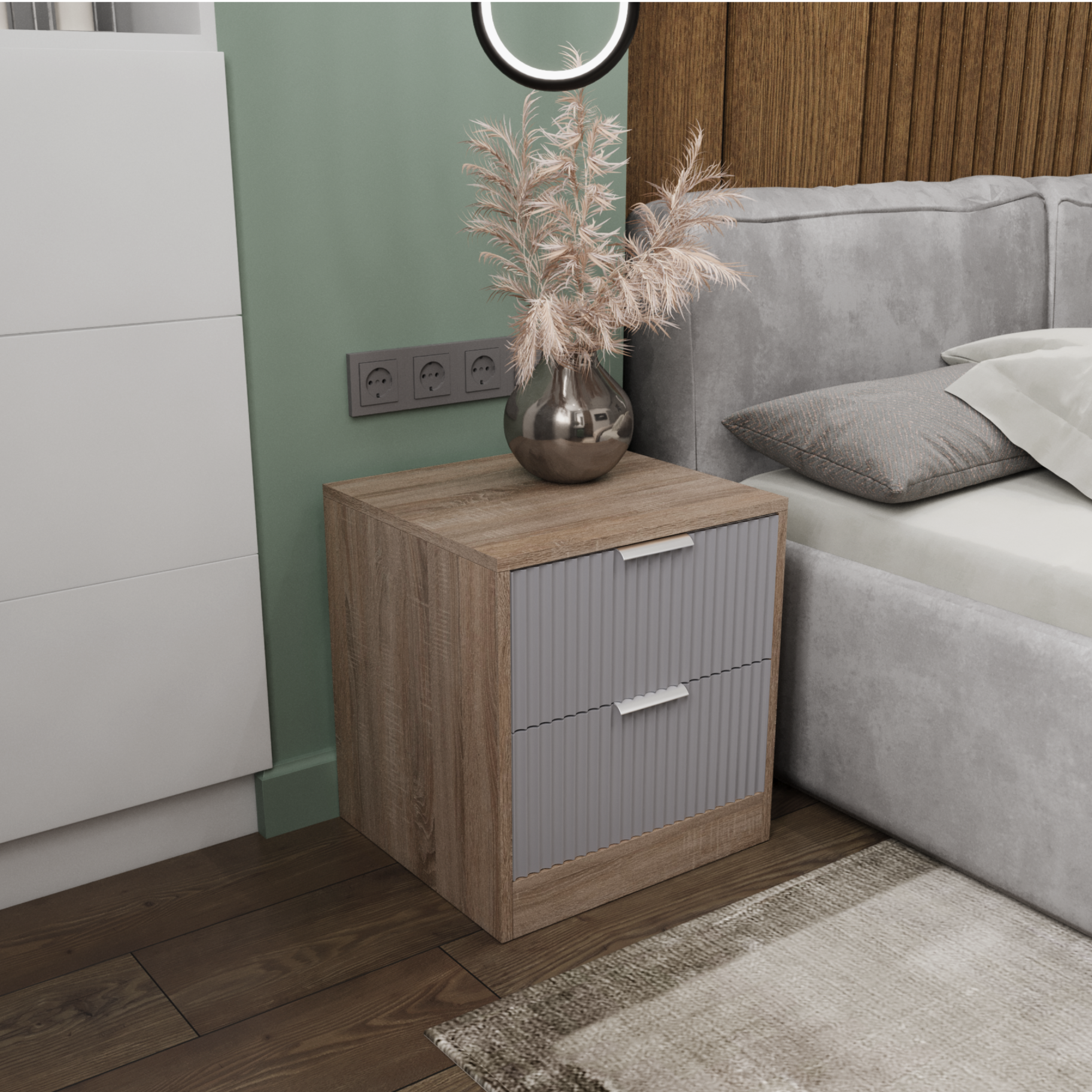 Тумба прикроватная без ручек KOMODO Дуб Крафт Белый/Железный камень (серый), 2 ящика, 47х40х48
