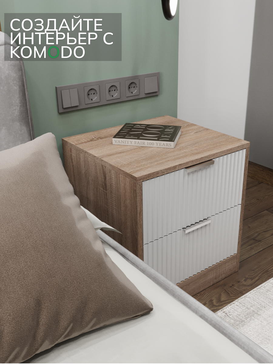 Тумба прикроватная без ручек KOMODO Дуб Крафт Белый/Железный камень, 2 ящика, 47х40х48