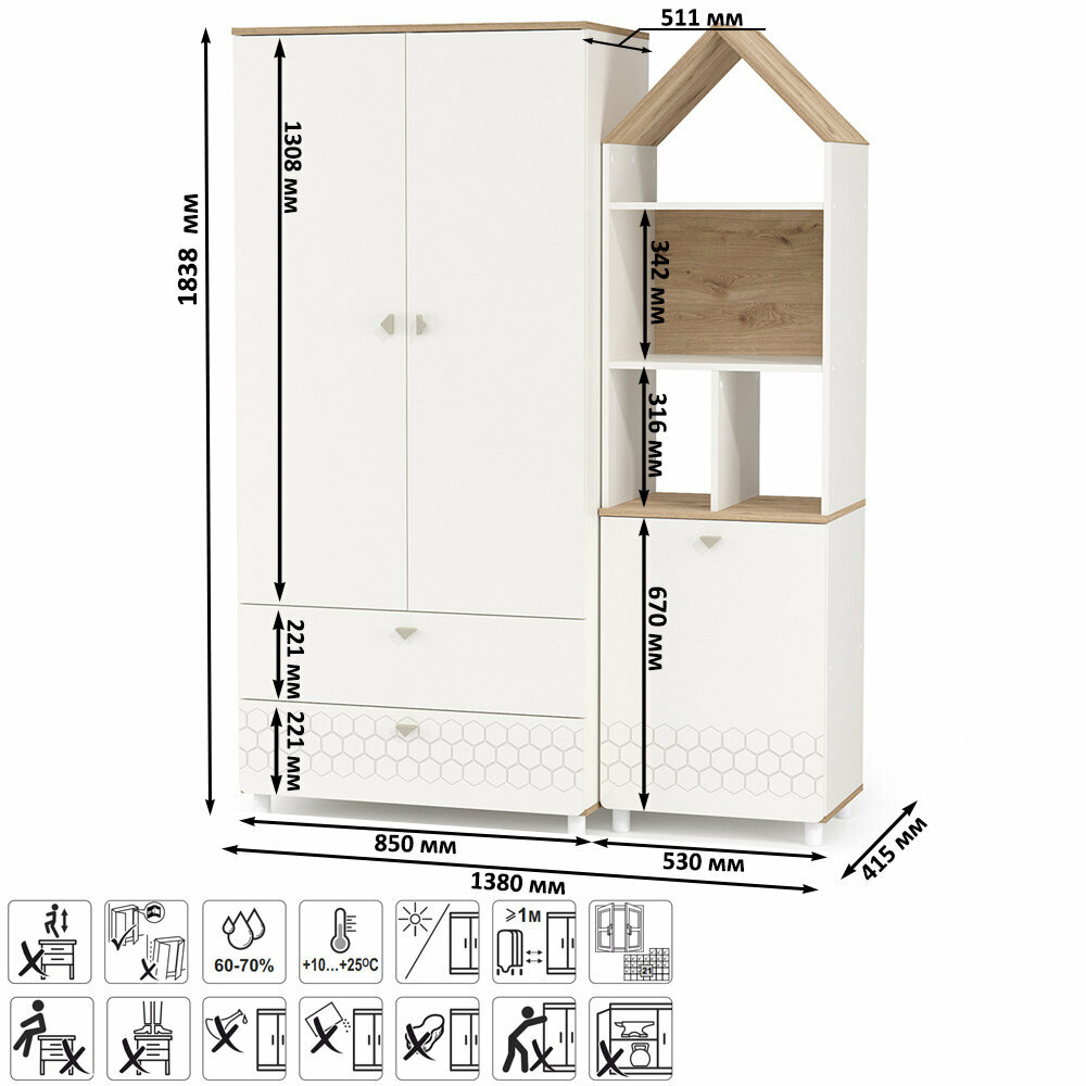 | Комплектация | за дверками шкафа отделение со штангой и отделение с тремя полка, в нижней части 2 ящика; верхняя часть стеллажа выполнена в виде крыши домика |