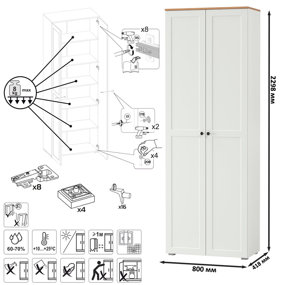 | Комплектация | шкаф с двумя распашными дверьми предлагает удобное решение для хранения вашей одежды и аксессуаров, в его верхней части устроена антресольная полка, предназначенная для головных уборов, под ней горизонтальная штанга для одежды на плечиках обеспечивает удобное их размещение, полка и ниша внизу добавляют дополнительное пространство для аксессуаров или других вещей. |