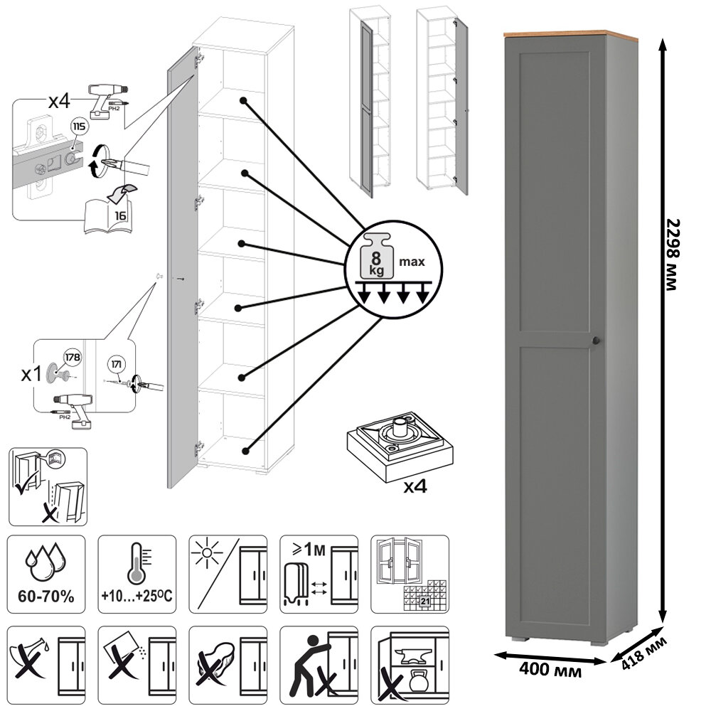 | Комплектация | шкаф с двумя распашными дверьми предлагает удобное решение для хранения вашей одежды и аксессуаров, в его верхней части устроена антресольная полка, предназначенная для головных уборов, под ней горизонтальная штанга для одежды на плечиках обеспечивает удобное их размещение, полка и ниша внизу добавляют дополнительное пространство для аксессуаров или других вещей. |