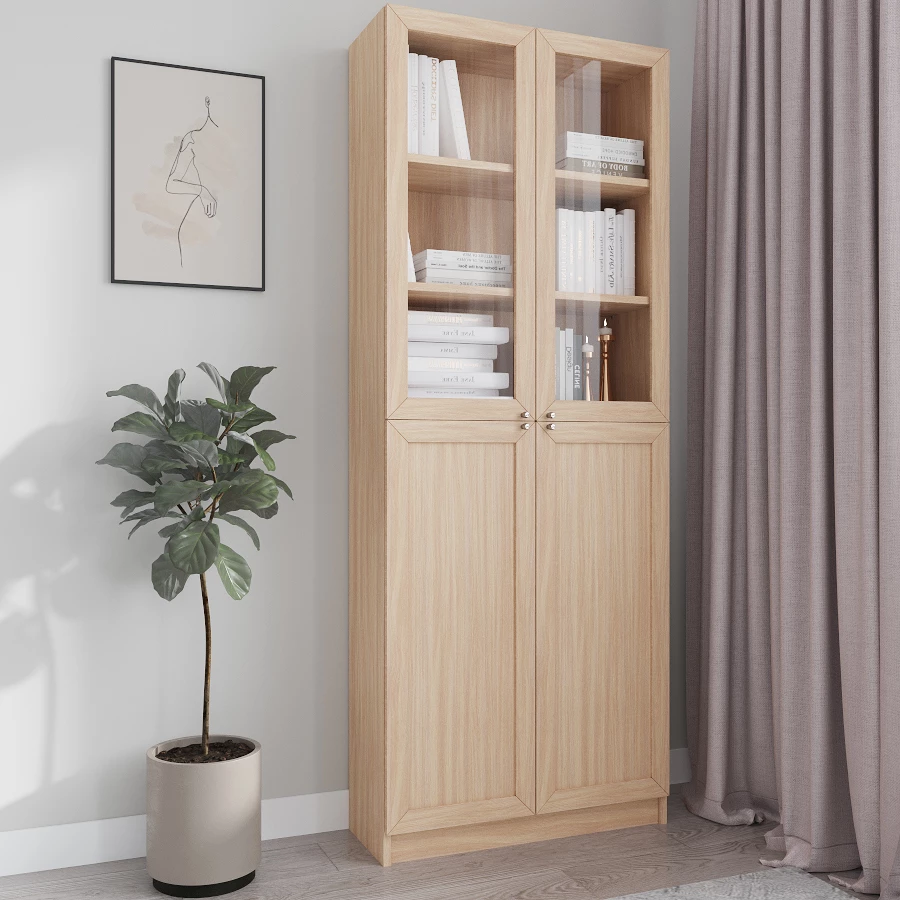 Шкаф стеллаж Билли Billy по мотивам Икеа 11, 120х30х202 см, Дуб молочный ЛДСП/рамка МДФ/стекло