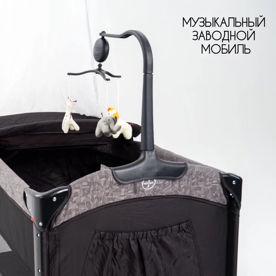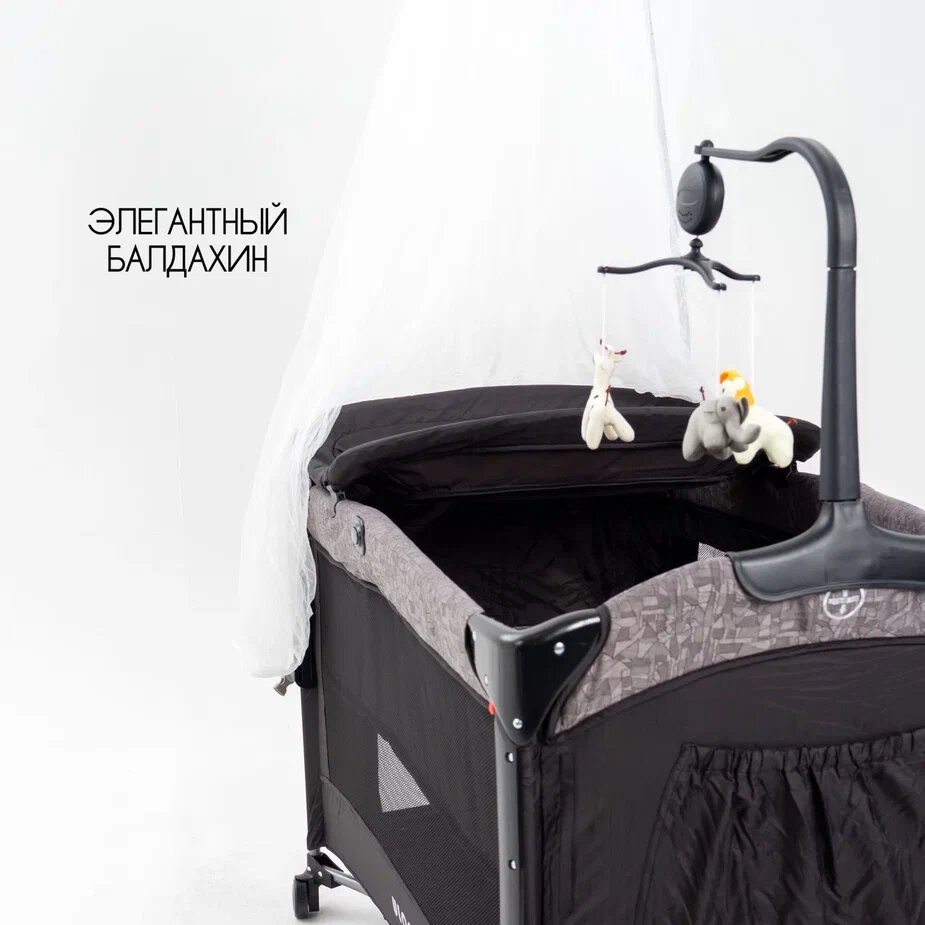 | Комплектация | Кроватка-манеж Пеленальный столик Держатель балдахина Балдахин Музыкальный мобильный Игрушки на мобильный - 3 шт Ремешок для фиксации Колесики - 4 шт Органайзер для бутылочек и подгузников Сумка для транспортировки Инструкция |
