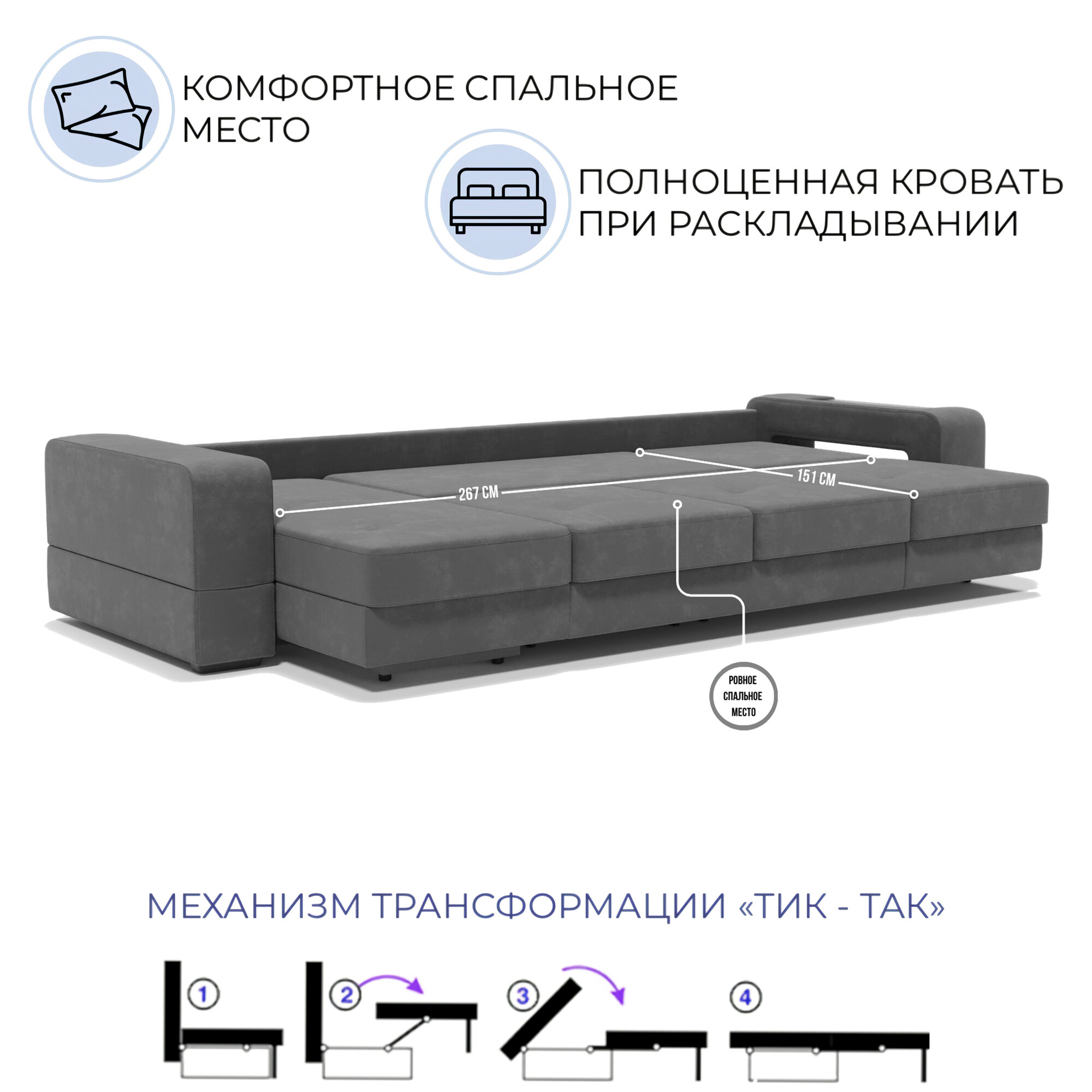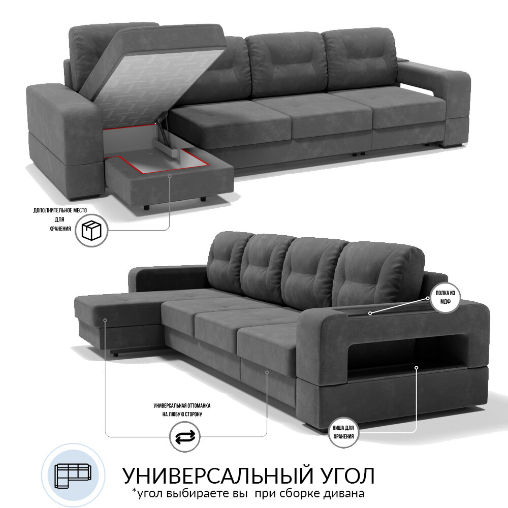 СохранитьУгловой диван в гостиную «Барон 2 с оттоманкой», раскладной диван трансформер на механизме «тик-так», 317х151х90см, серый интересное: