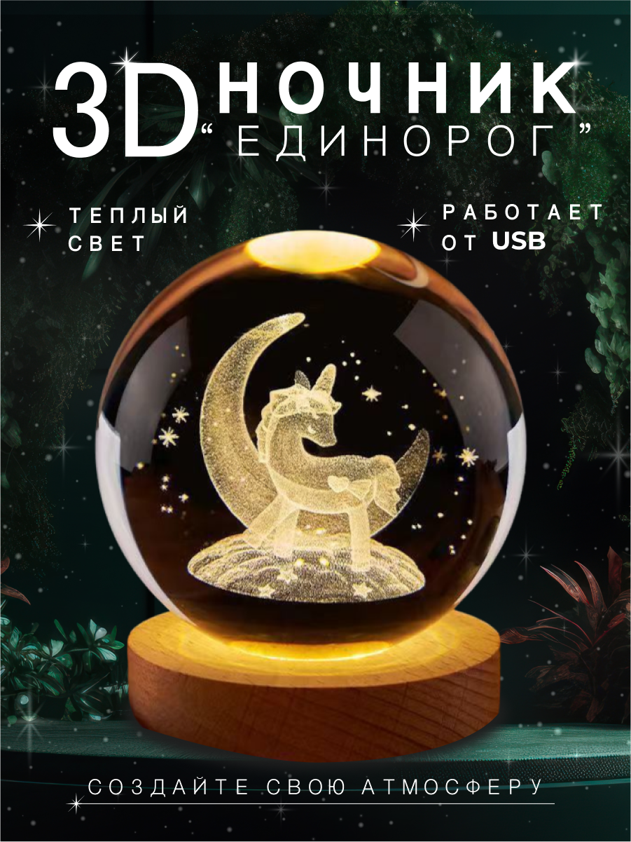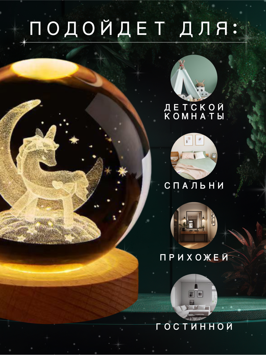 Ночник детский стеклянный шар светильник единорог интересное: