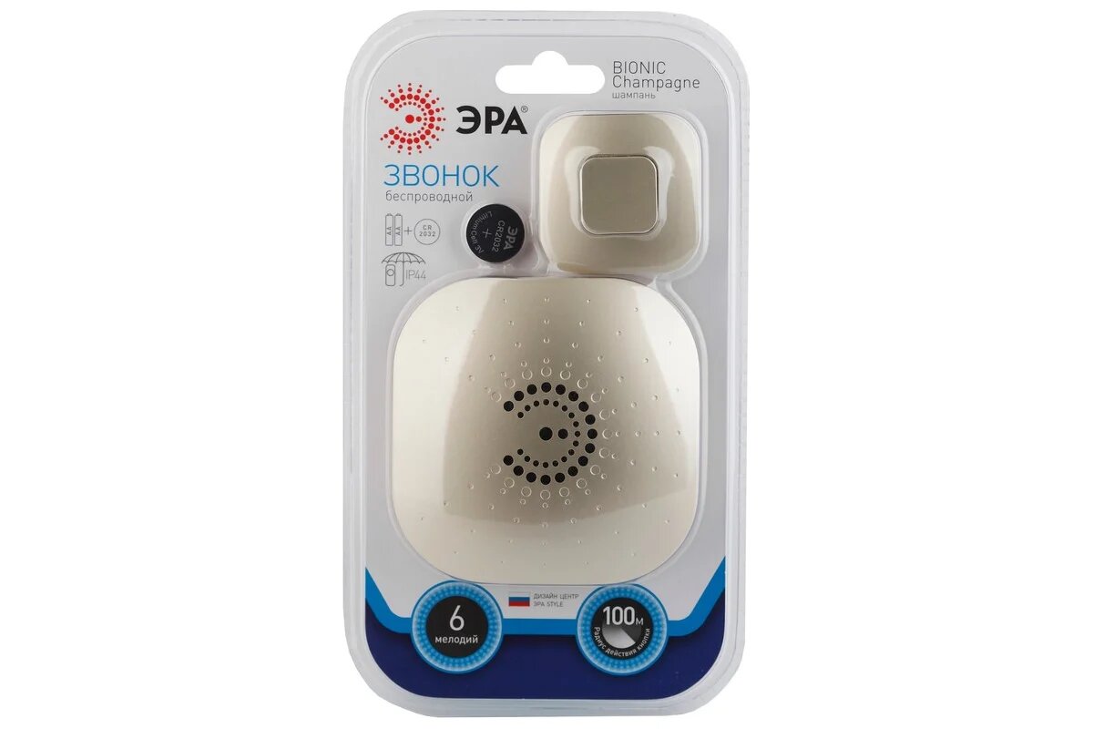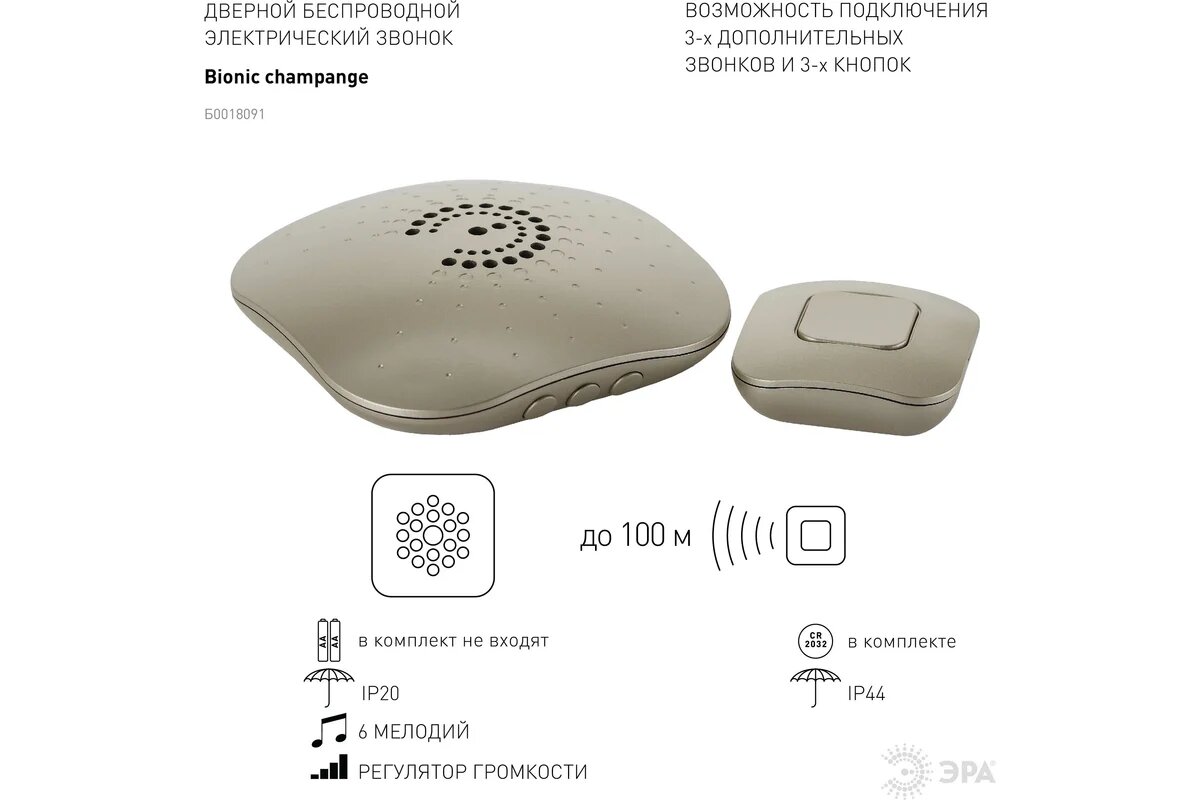 Звонок ЭРА BIONIC Champagne б/проводной рег. громк, 6 мел, кнопка IP44 (10/60/240) =5055398690697= интересное: