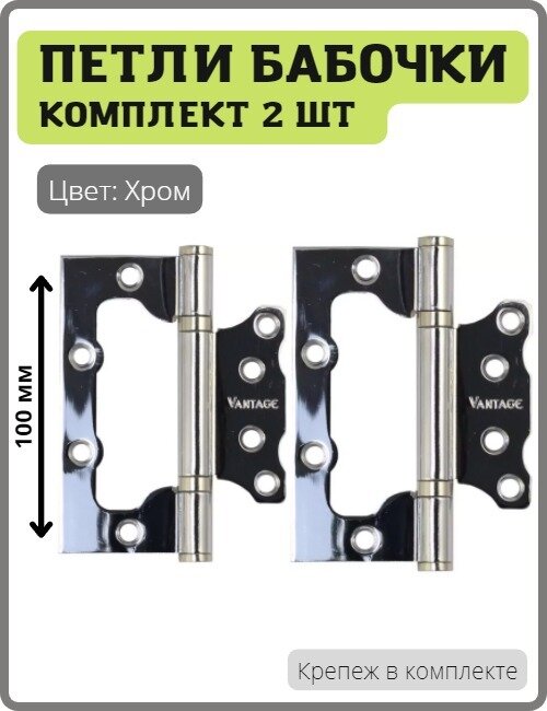 Купить Петли-бабочки дверные Vantage 2BB-CP накладные универсальные для межкомнатных дверей (без врезки, навес) 100 мм цвет хром, комплект 2 шт