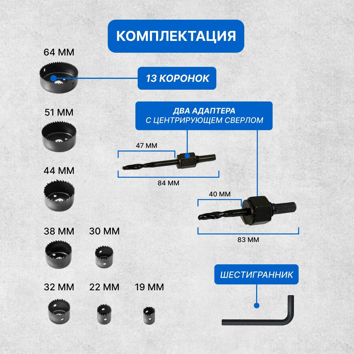 | В комплекте | адаптер, кольцевая пила, коронка, центрирующее сверло |