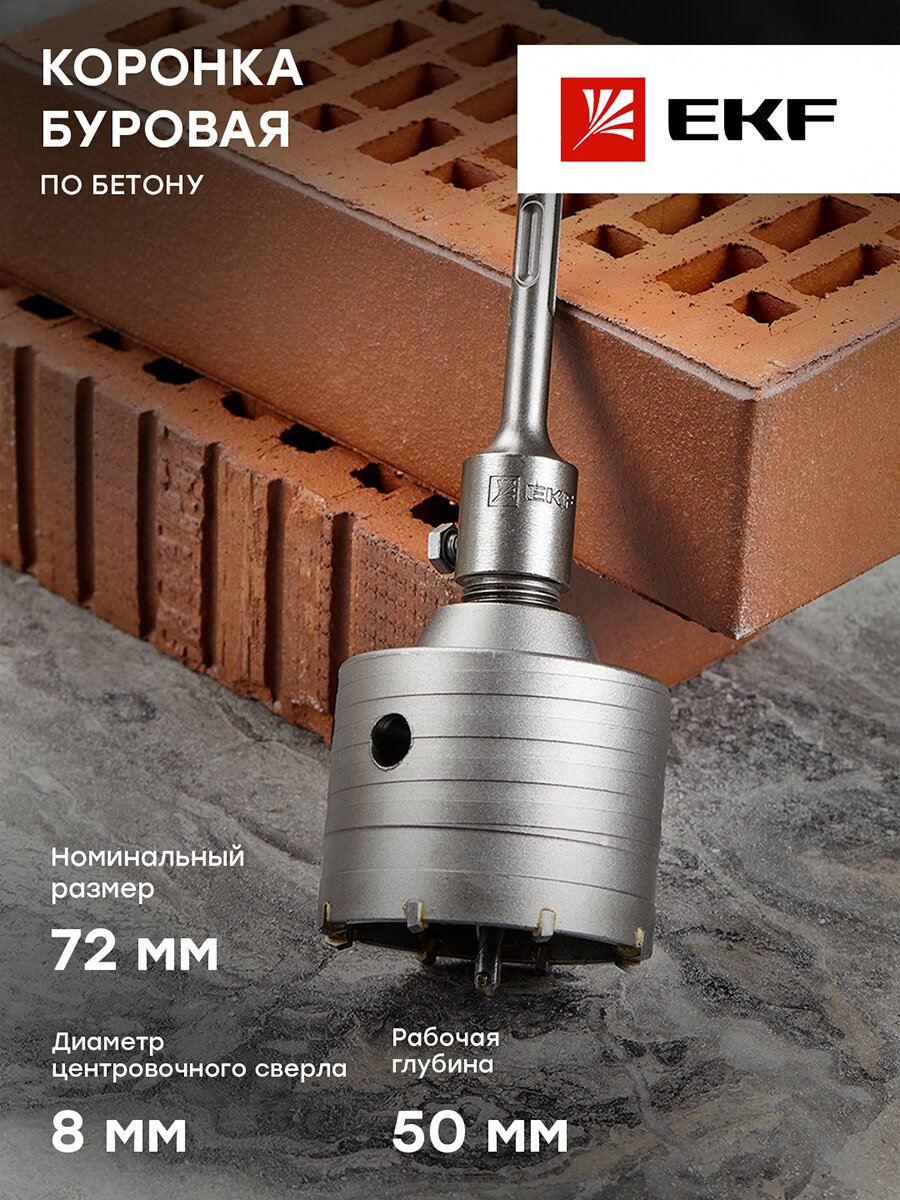 Коронка буровая EKF по бетону с оснасткой TCT-72, SDS-plus
