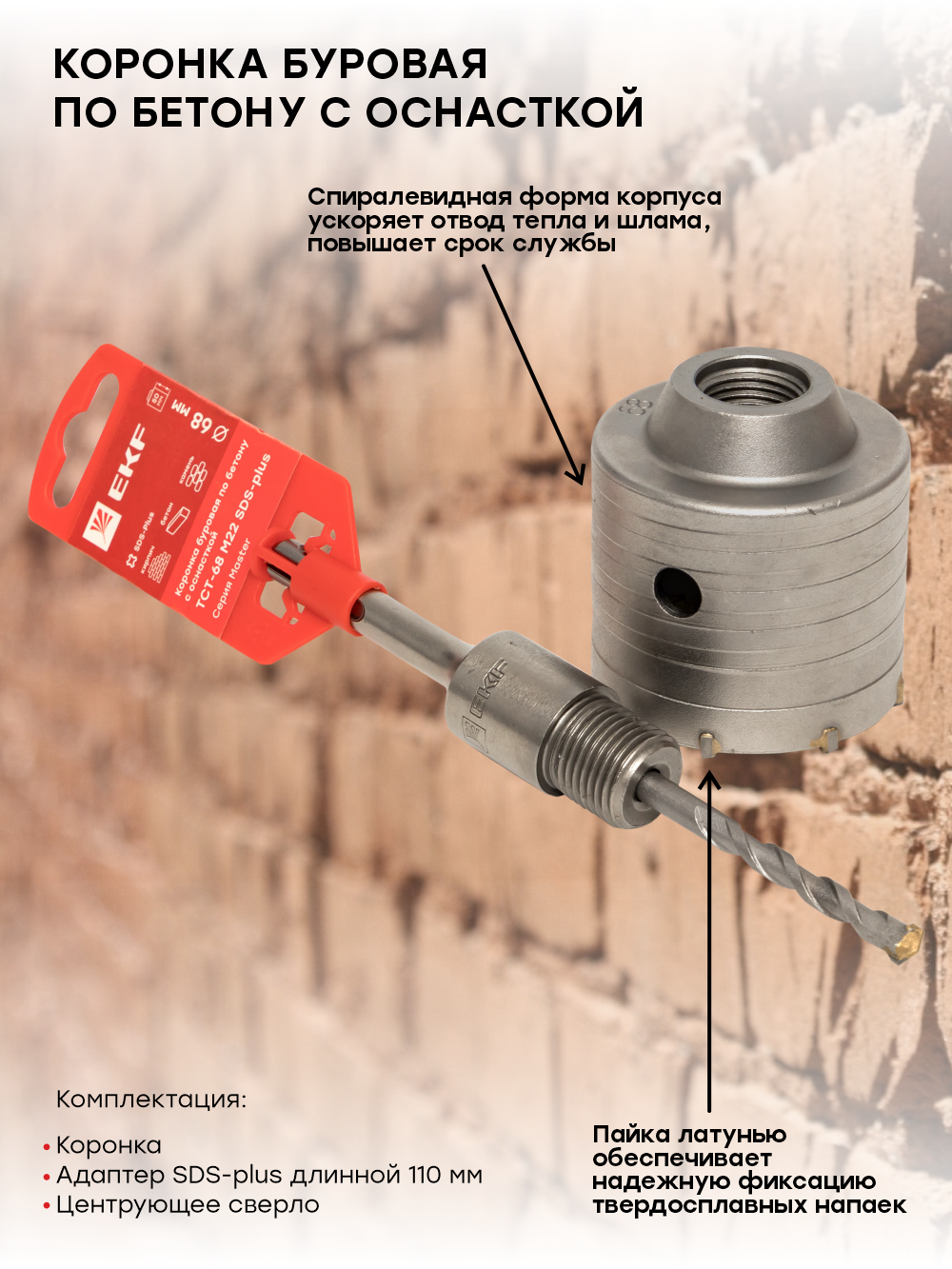 Коронка буровая по бетону с оснасткой Ekf TCT-68 М22 SDS-plus Master, tct-68-m22