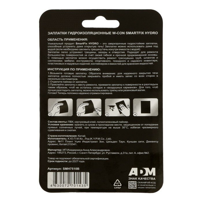 | Дополнительная информация | Заплатки гидроизоляционные SmartFix 7.5х10 см, 2 шт. |