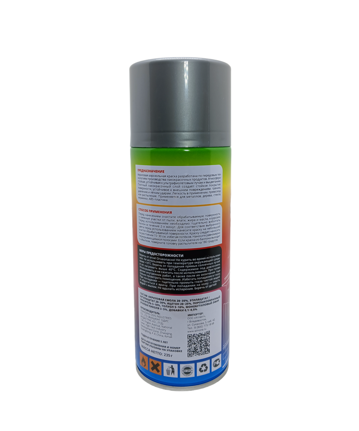 | Дополнительная информация | Очистите обрабатываемую поверхность и смежные участки от пыли, влаги, жира и масла, коррозии Тщательно взболтайте баллон в течение 2-х минут Предварительно проверьте соответствие выбранного цвета, для этого нанесите краску на небольшой участок обрабатываемой поверхности Начните покраску поверхности - краску следует наносить на расстоянии 15-30 см равномерно перекрывающимися полосами, избегая потеков Если краска из баллона выходит с избытком, поверните головку распылителя на 180 градусов |