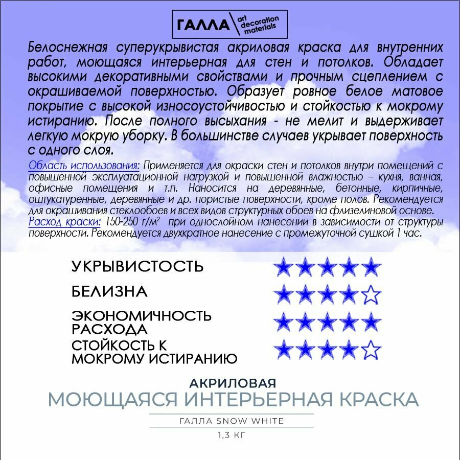 Краска акриловая белоснежная интерьерная моющаяся галла SNOW WHITE, ПП ведро 1,3кг интересное: