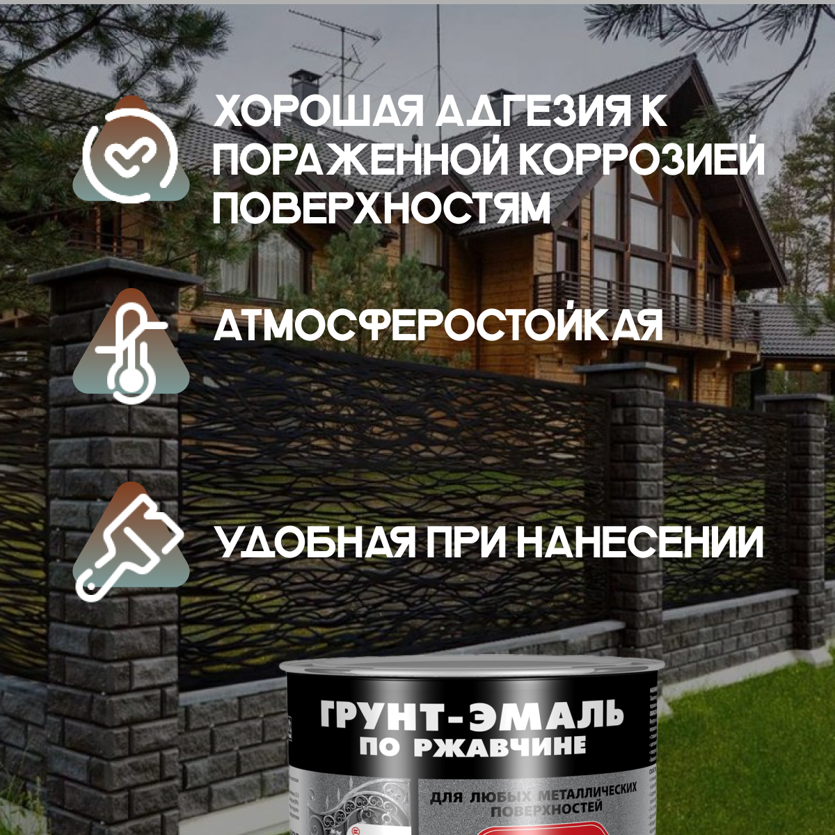 | Дополнительная информация | Назначение:Защитно-декоративная обработка различных металлических поверхностей, в том числе пораженных точечной или сплошной коррозией c толщиной ржавчины до 100 мкмОбласть применения:Внутри и снаружи помещений по ЛЮБЫМ металлическим поверхностям, новым и ранее окрашенным:стальным и чугунным (решетки, ограды, гаражи, ворота и пр.)цветным металлам (цинк, медь, алюминий)поверхностям из оцинкованного металла (профнастил) и нержавеющей сталибиметаллическим поверхностям (например, радиаторам отопления) |