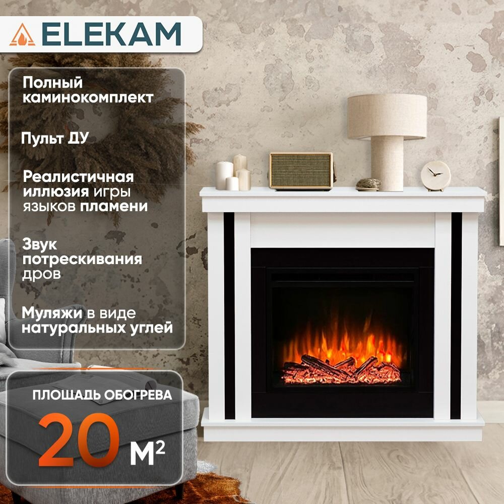 Камин электрический ELEKAM NEO белый+чёрный с очагом с пультом, обогревом и звуком потрескивания дров (Электрокамин)