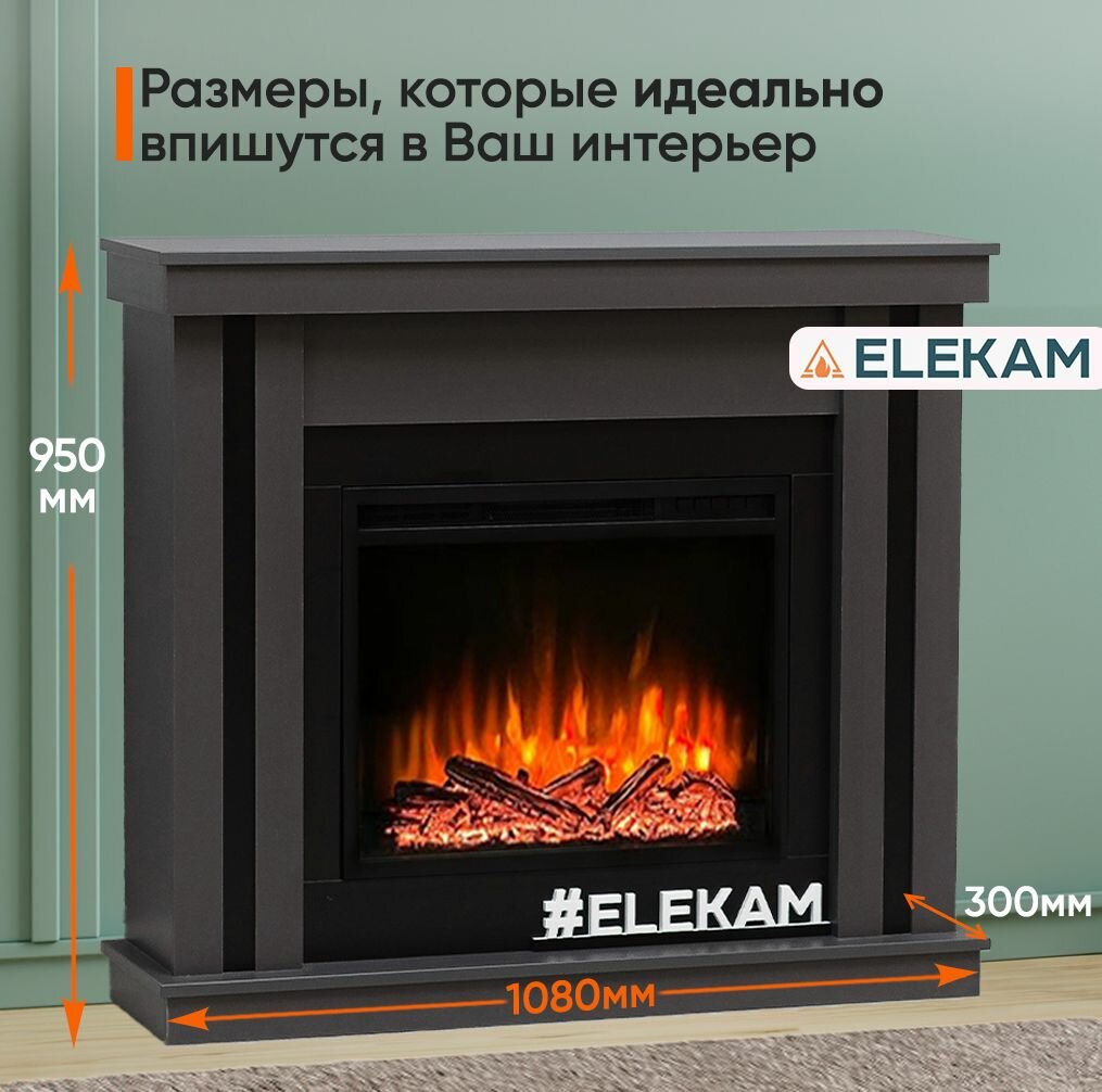 Камин электрический ELEKAM NEO серый+чёрный с очагом Velar с пультом, обогревом и звуком потрескивания дров (Электрокамин)